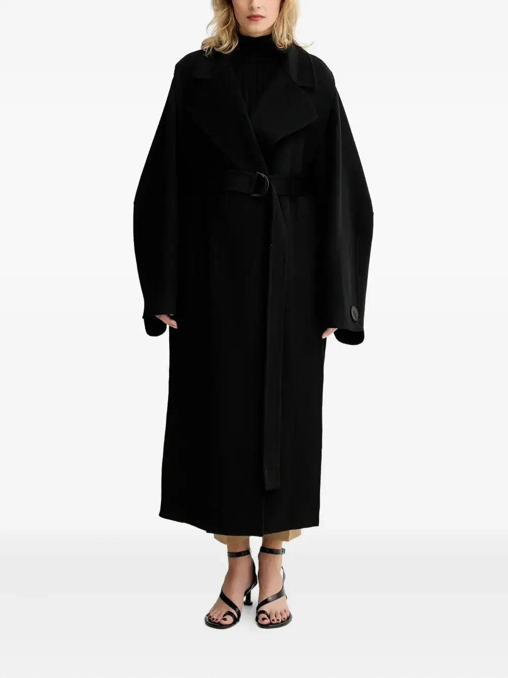 черный с поясом, с широкими лацканами, длинными рукавами, круглыми пуговицами