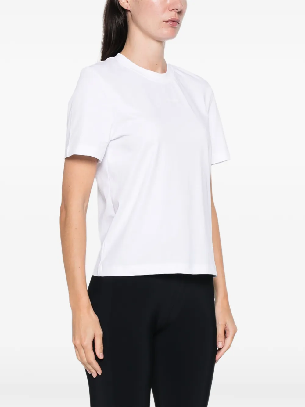 белая футболка с круглым вырезом, короткими рукавами и логотипом