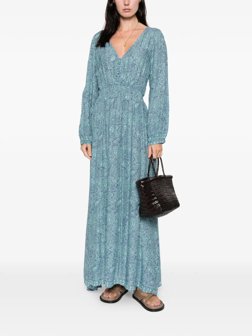 синий с принтом по всей поверхности, застежка на пуговицы, длинные рукава, эластичный пояс, длина до щиколотки