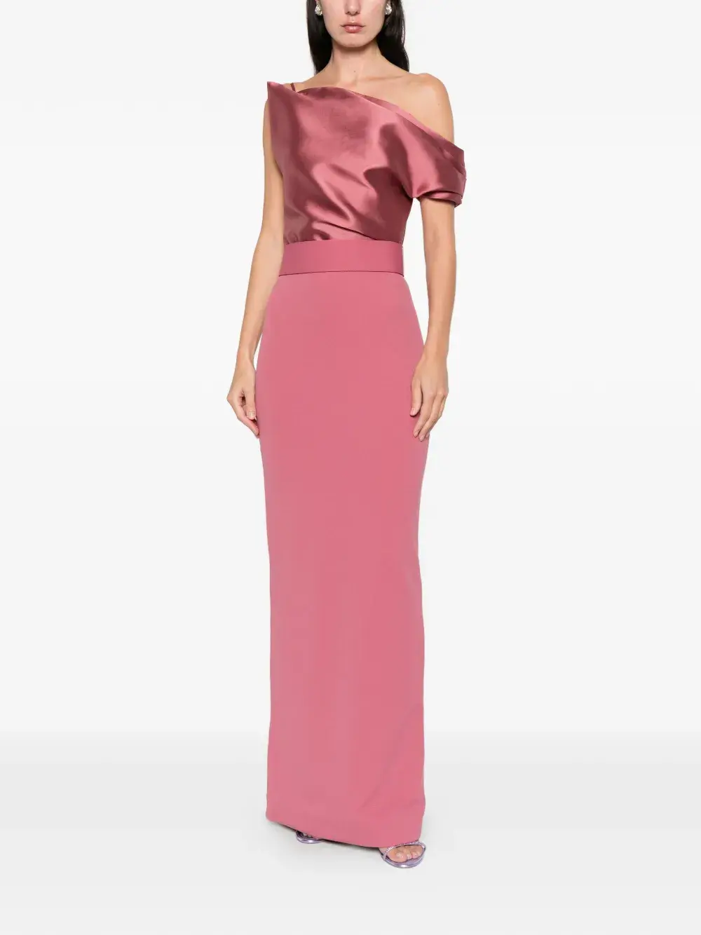 тёмно-розовый, асимметричный крой на одно плечо, панельная конструкция, скрытая застёжка-молния сзади, прямой низ, длина ниже колена