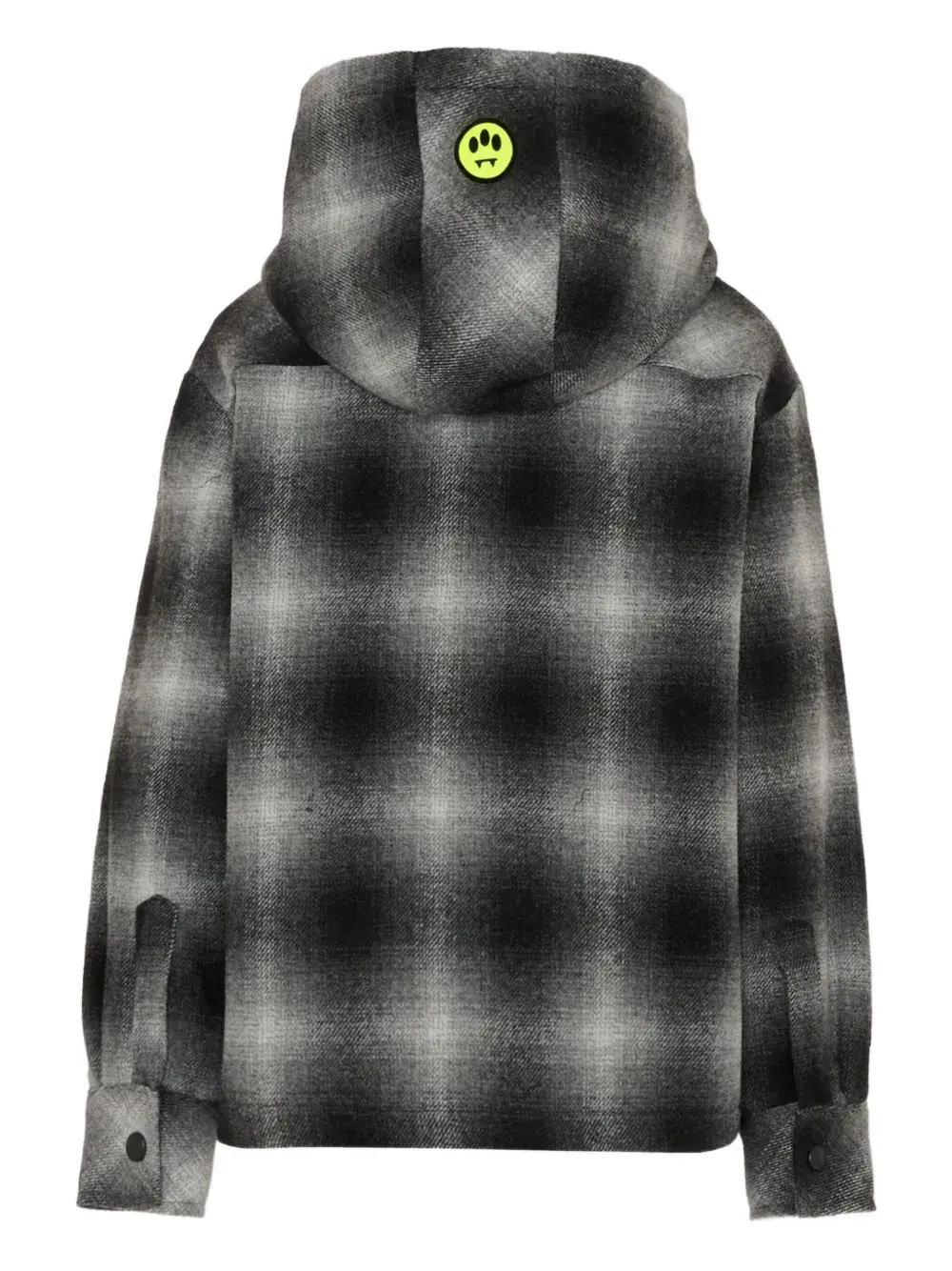 серо-черная куртка в клетку с капюшоном, нагрудными накладными карманами, застежкой на пуговицы и логотипом