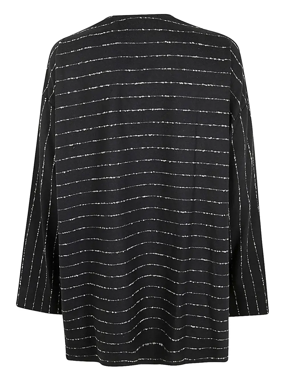 чёрно-слоново-кремовая полоска, застёжка на пуговицы спереди, V-образный вырез, накладные карманы спереди, длинные рукава