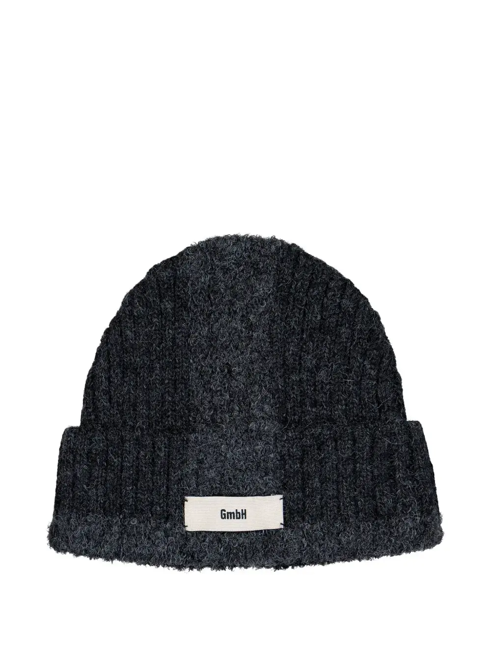 темно-серая вязаная шапка в рубчик с отворотом и логотипной нашивкой