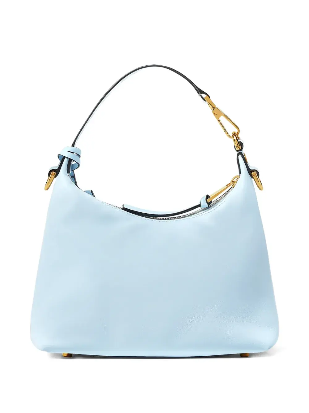 светло-голубой цвет, фурнитура цвета золота, верхняя ручка, застежка на молнии сверху, логотип-буквы, подвеска-голова Медузы