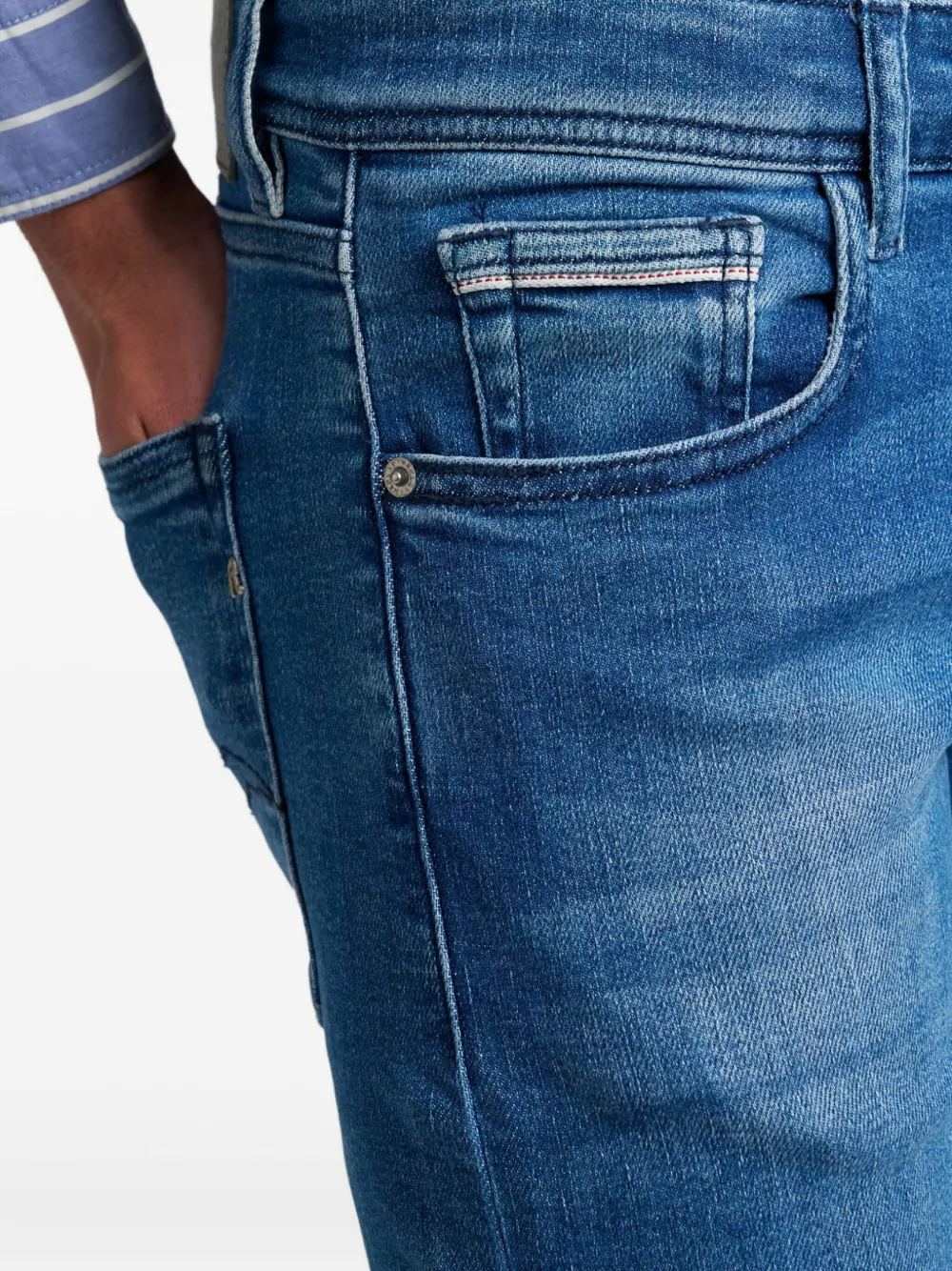 синие джинсы с пятью карманами, нашивкой с логотипом и тональной прострочкой