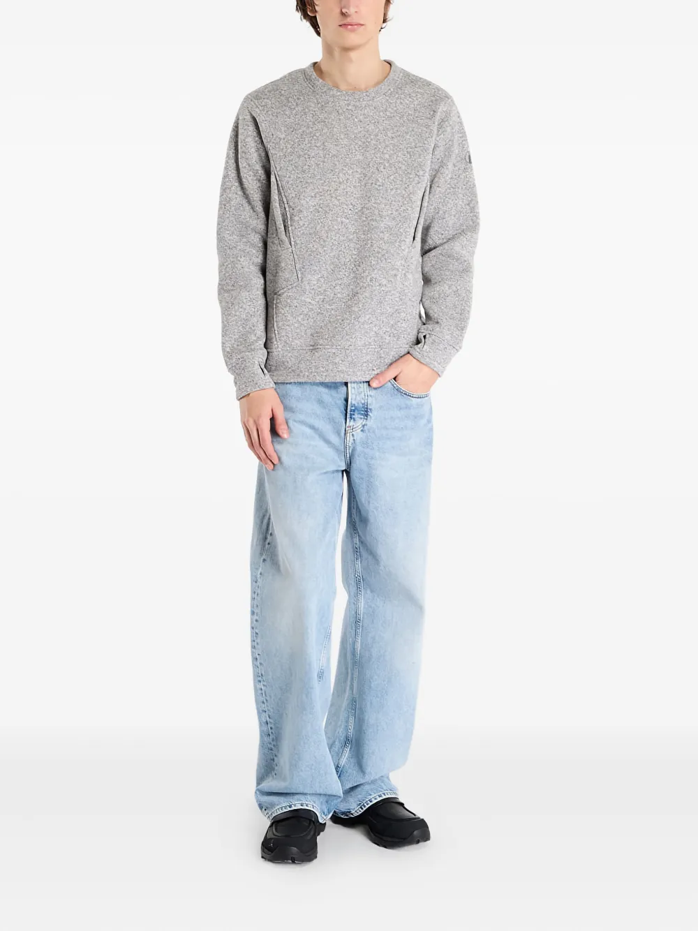 серый свитер с круглым вырезом и длинными рукавами
