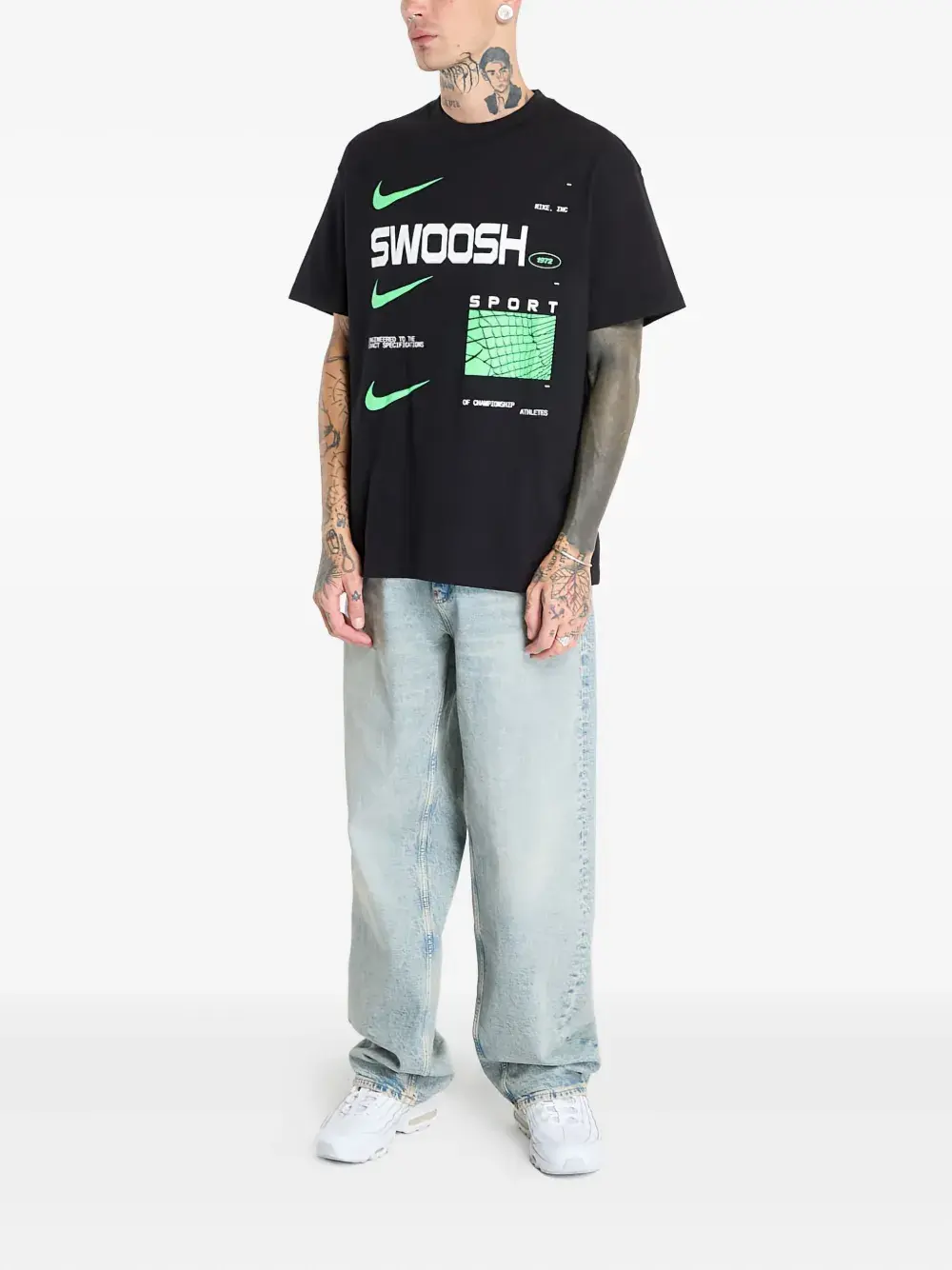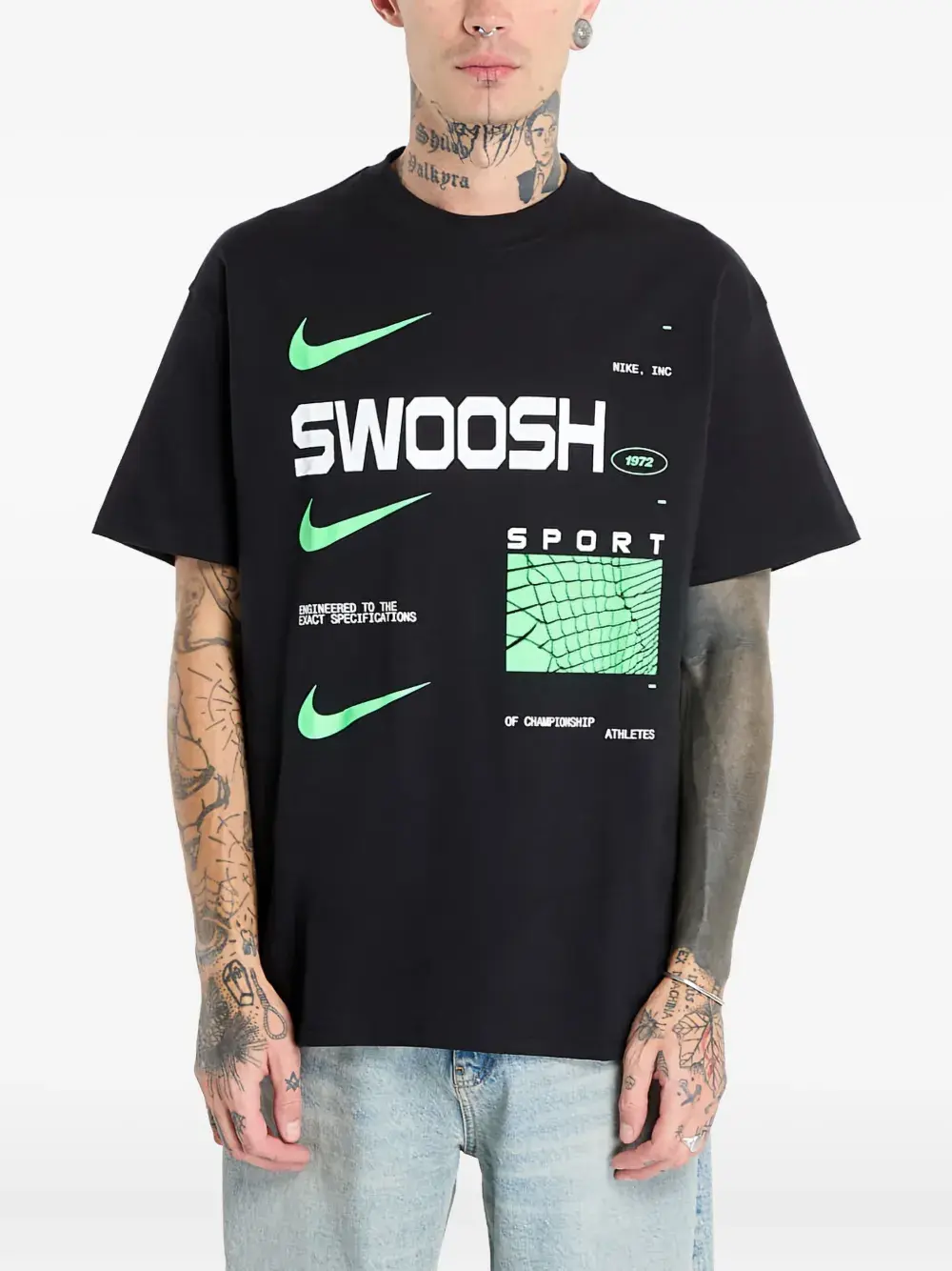 чёрная футболка с графическим принтом, круглым вырезом и короткими рукавами