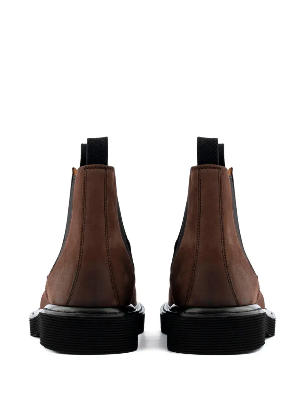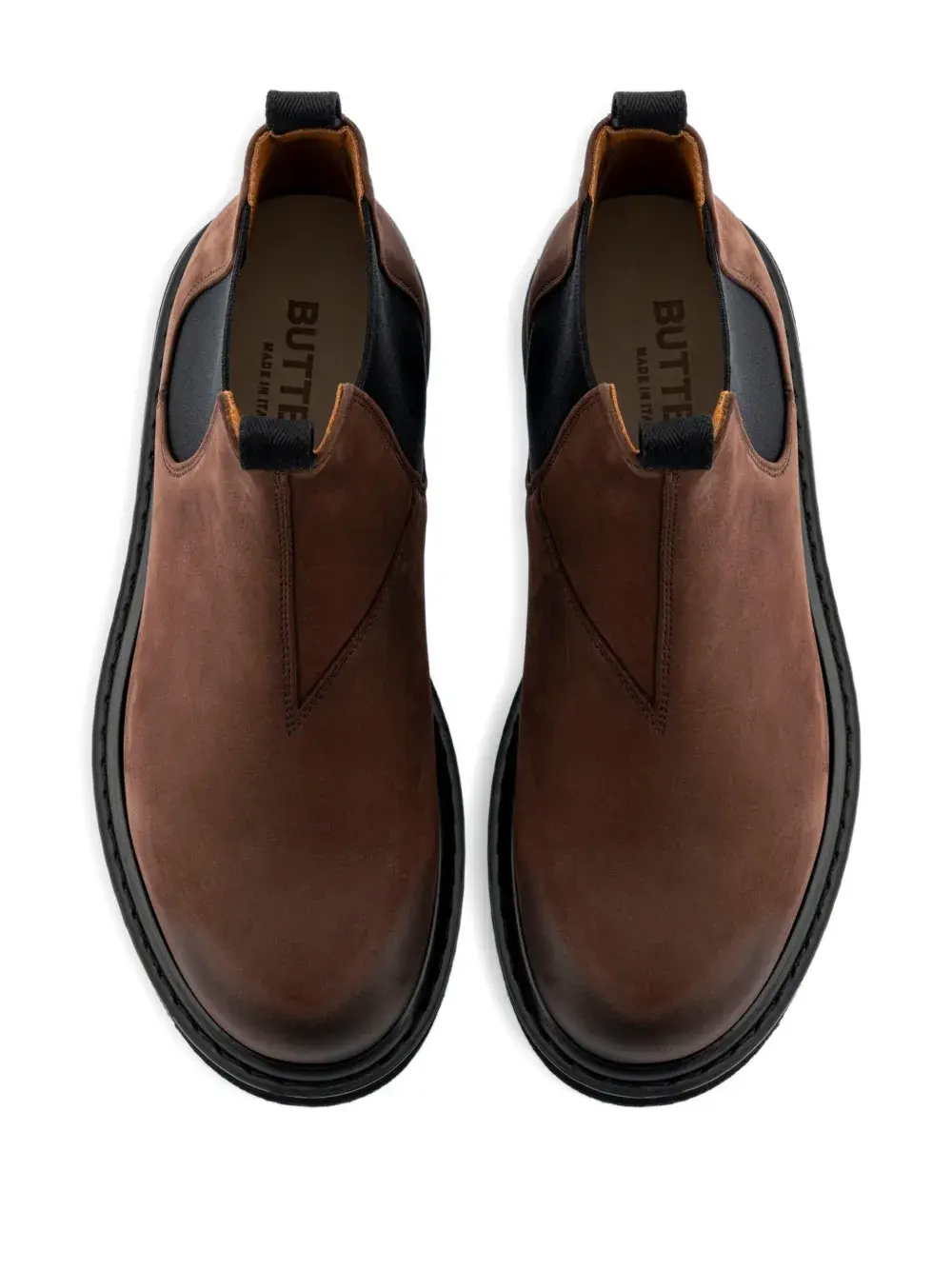 коричневые, с двумя язычками для натягивания на голенище, эластичные вставки по бокам, круглый носок, длина до щиколотки