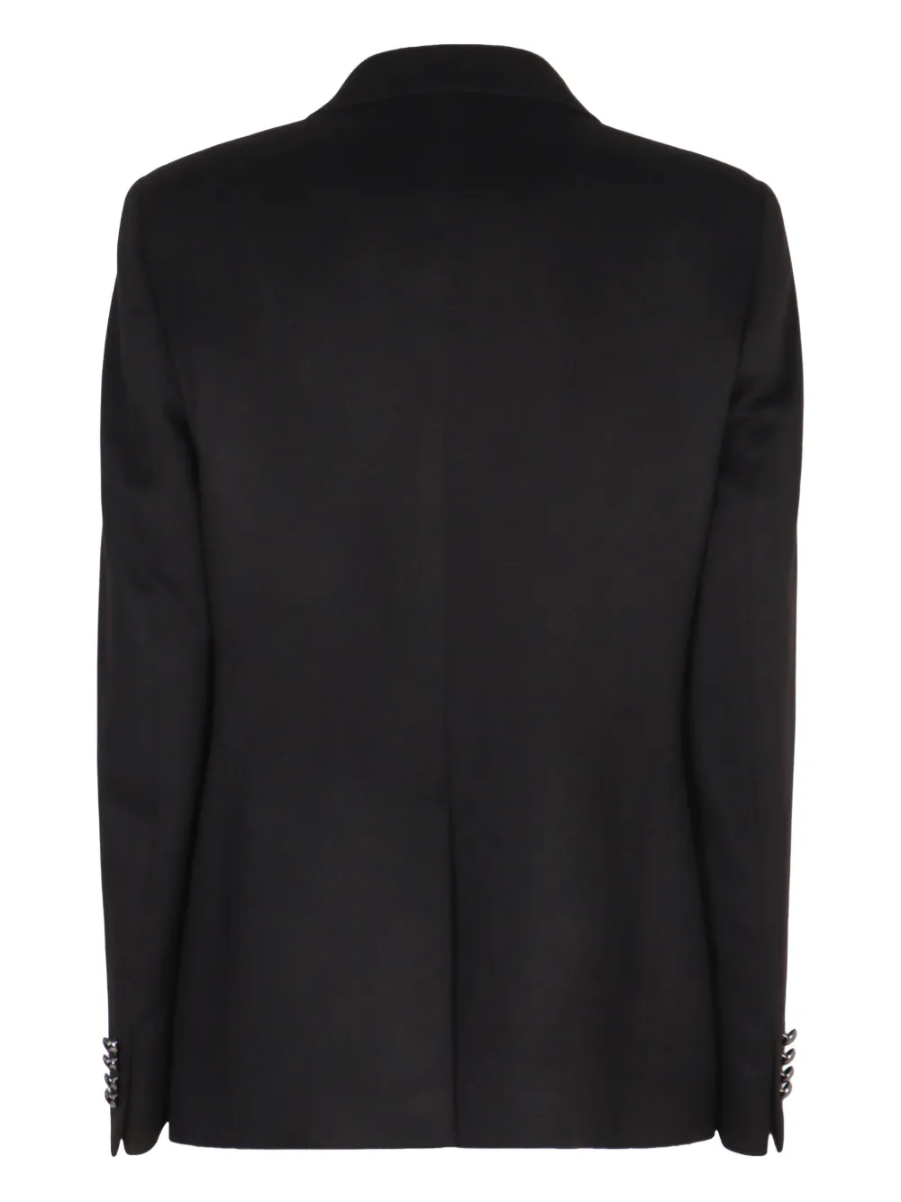 черный лацкан, два клапанных кармана, нагрудный карман, разрез сзади, двубортный