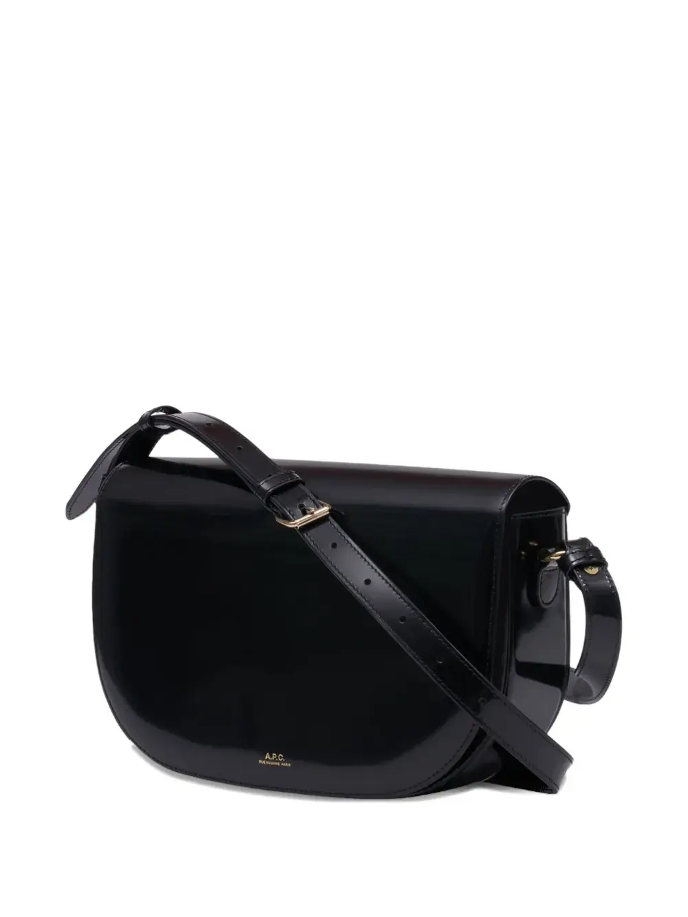 черная лаковая кожа, складная конструкция, магнитная застежка, регулируемый плечевой ремень, тисненый логотип, основное отделение, фурнитура золотистого цвета