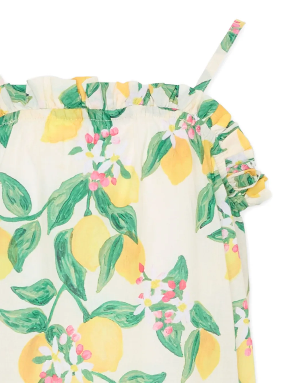 белое и зелёное платье с цветочным принтом, бретелями-спагетти и оборками