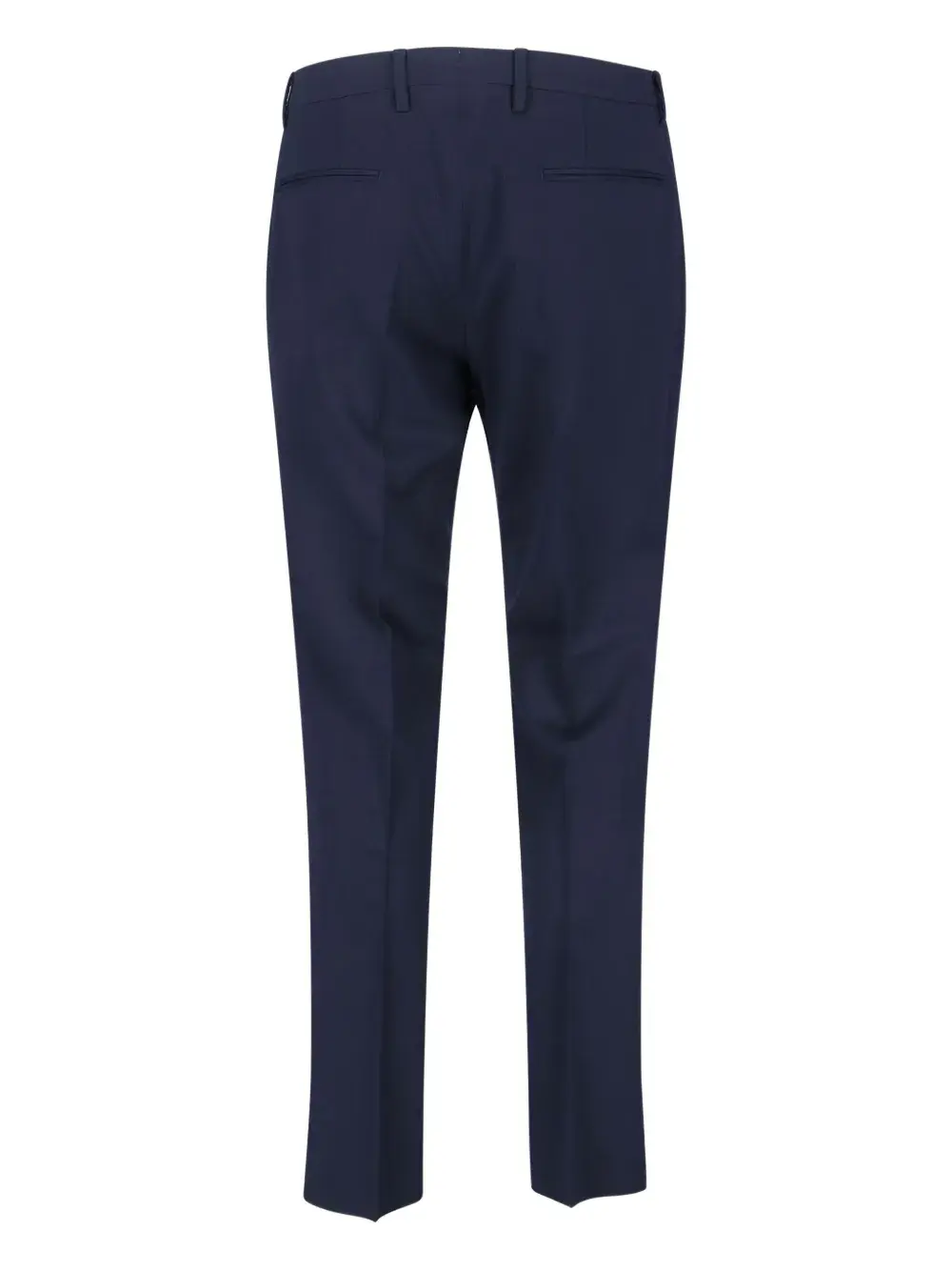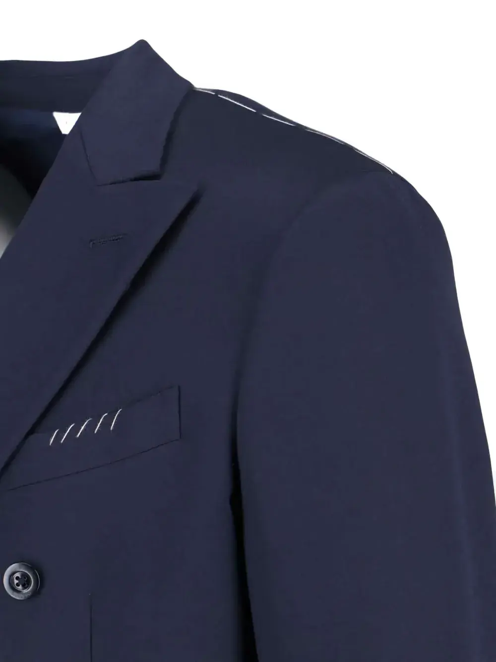 синий двубортный пиджак с застёжкой на пуговицы, клапанами на карманах и лацканами с вырезом