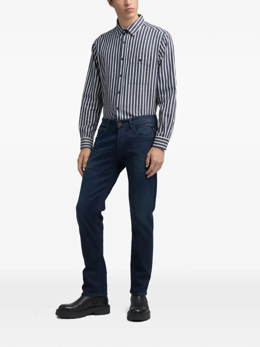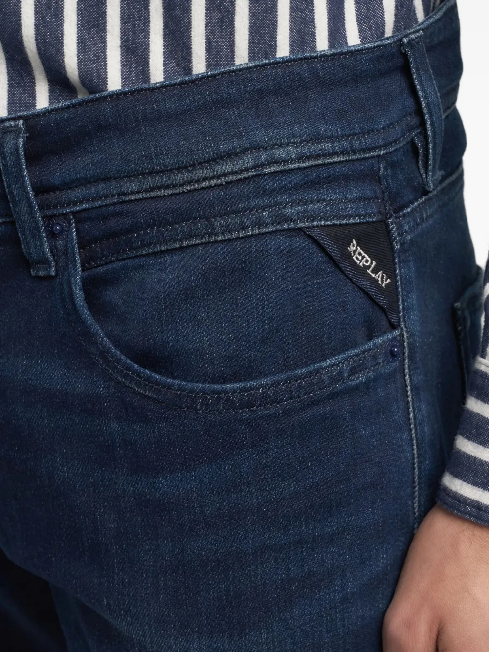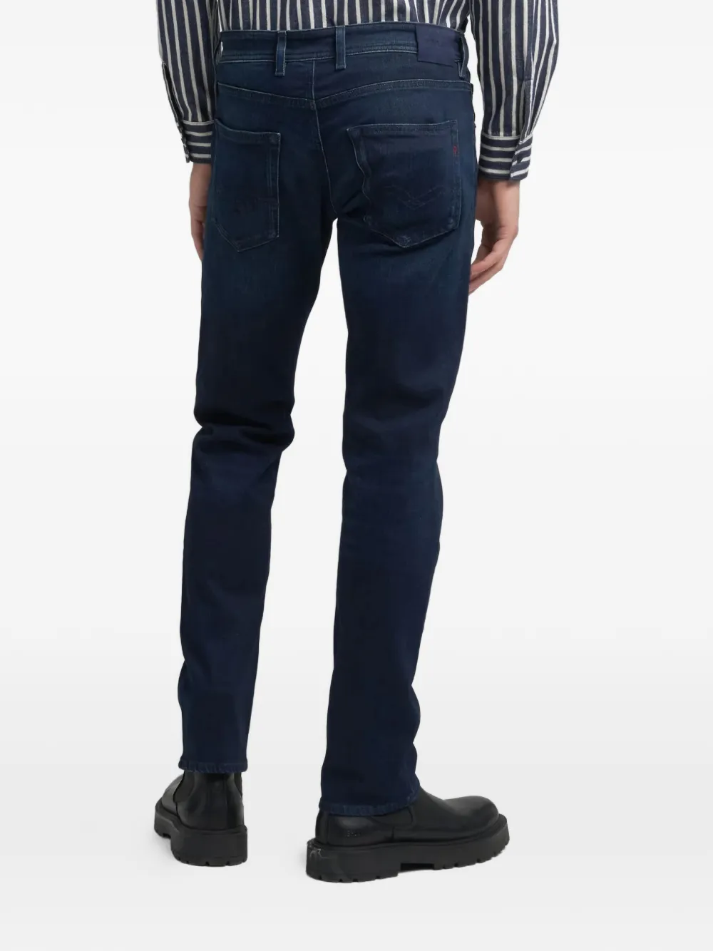синие джинсы с пятью карманами, нашивкой с логотипом, тональной отделкой строчкой, шлевками для пояса, стандартной отделкой