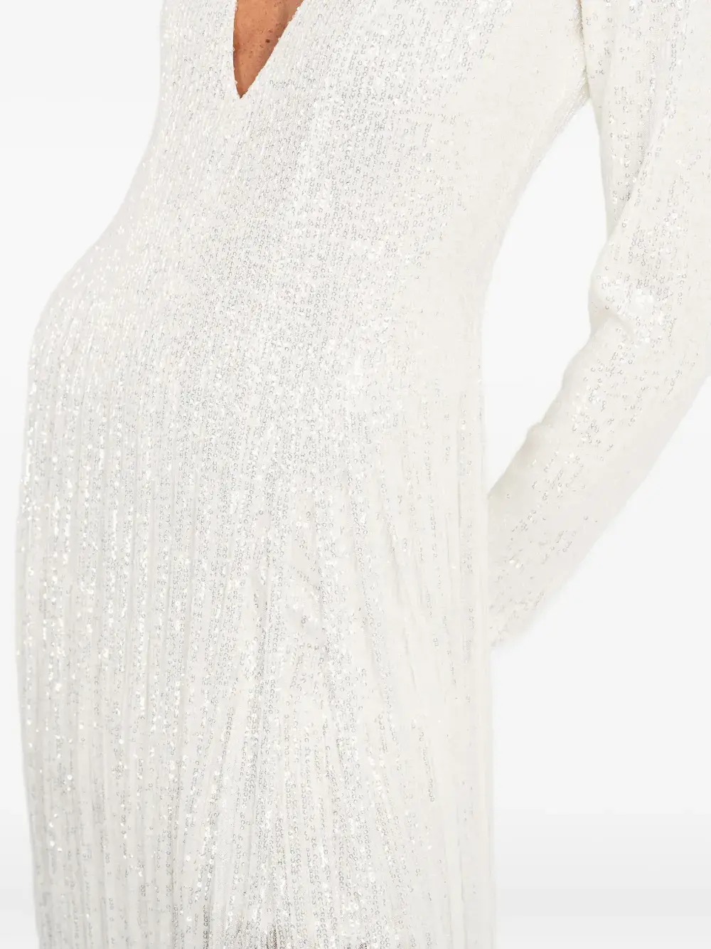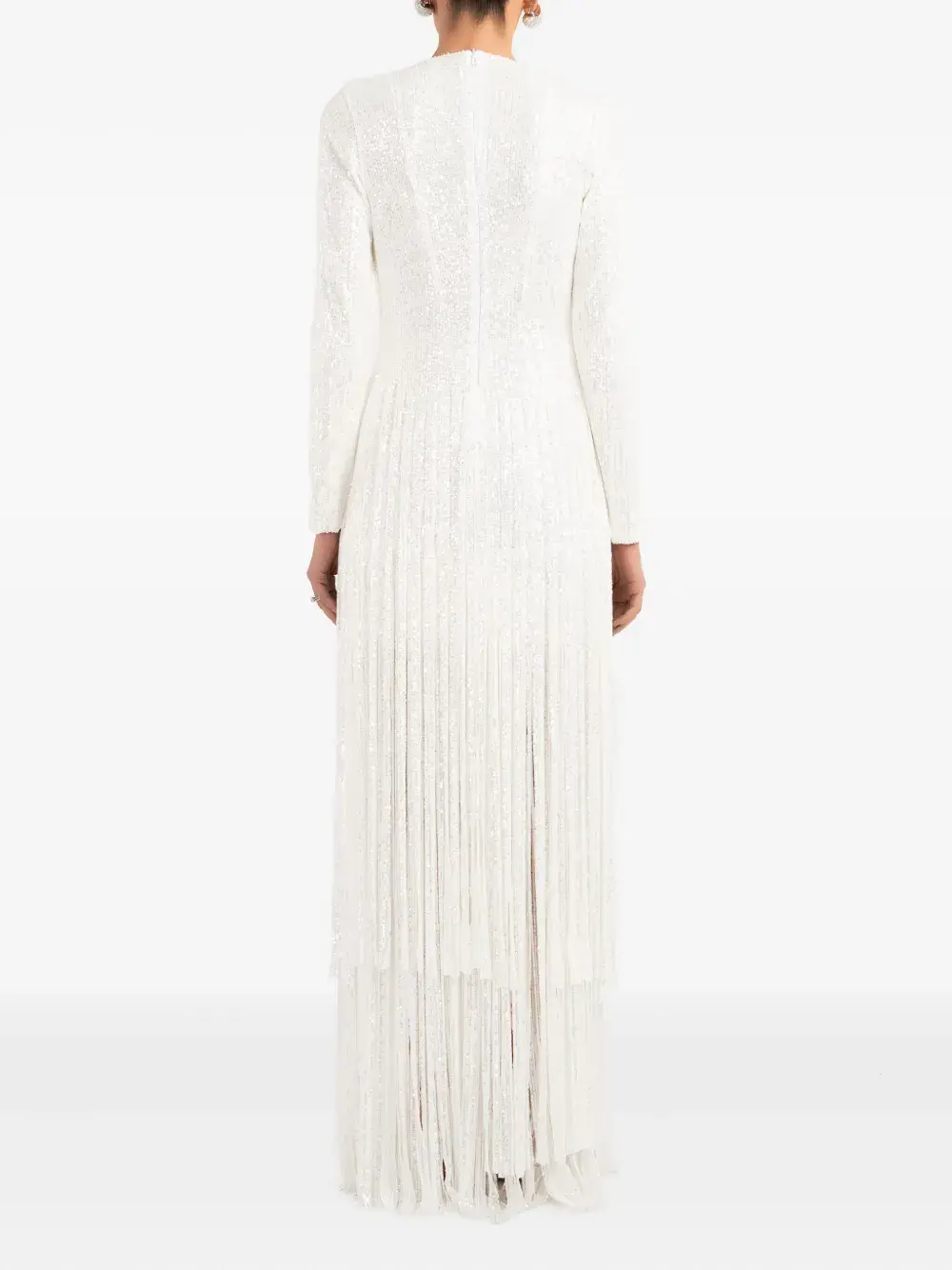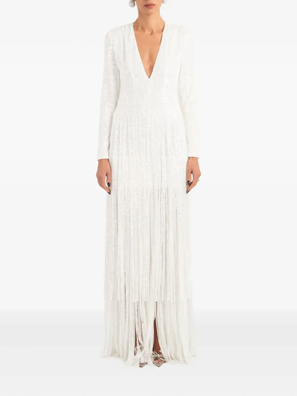 белые украшения из пайеток, отделка бахромой, V-образный вырез, длинные рукава