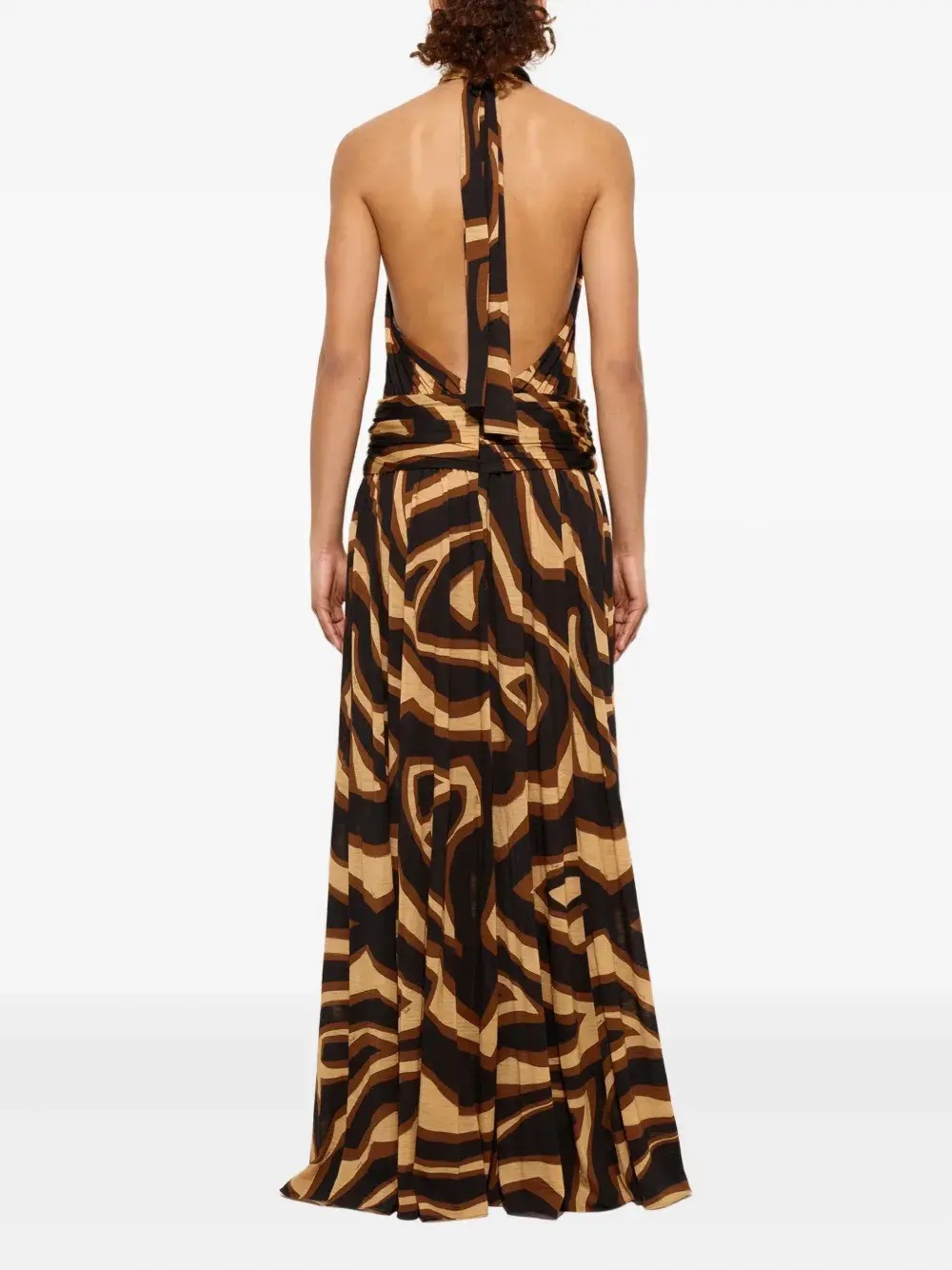 коричневый топ с абстрактным принтом, без рукавов, с воротом-халтер, открытой спиной и драпировкой