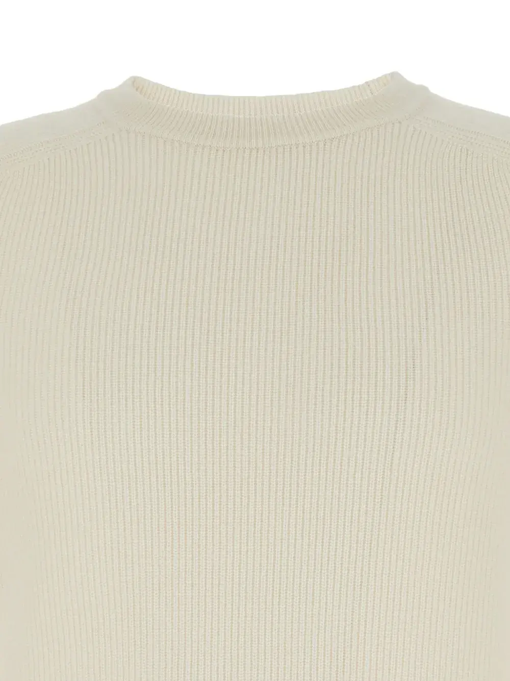 белый в рубчик вязаный свитер с круглым вырезом, длинными рукавами и прямым низом