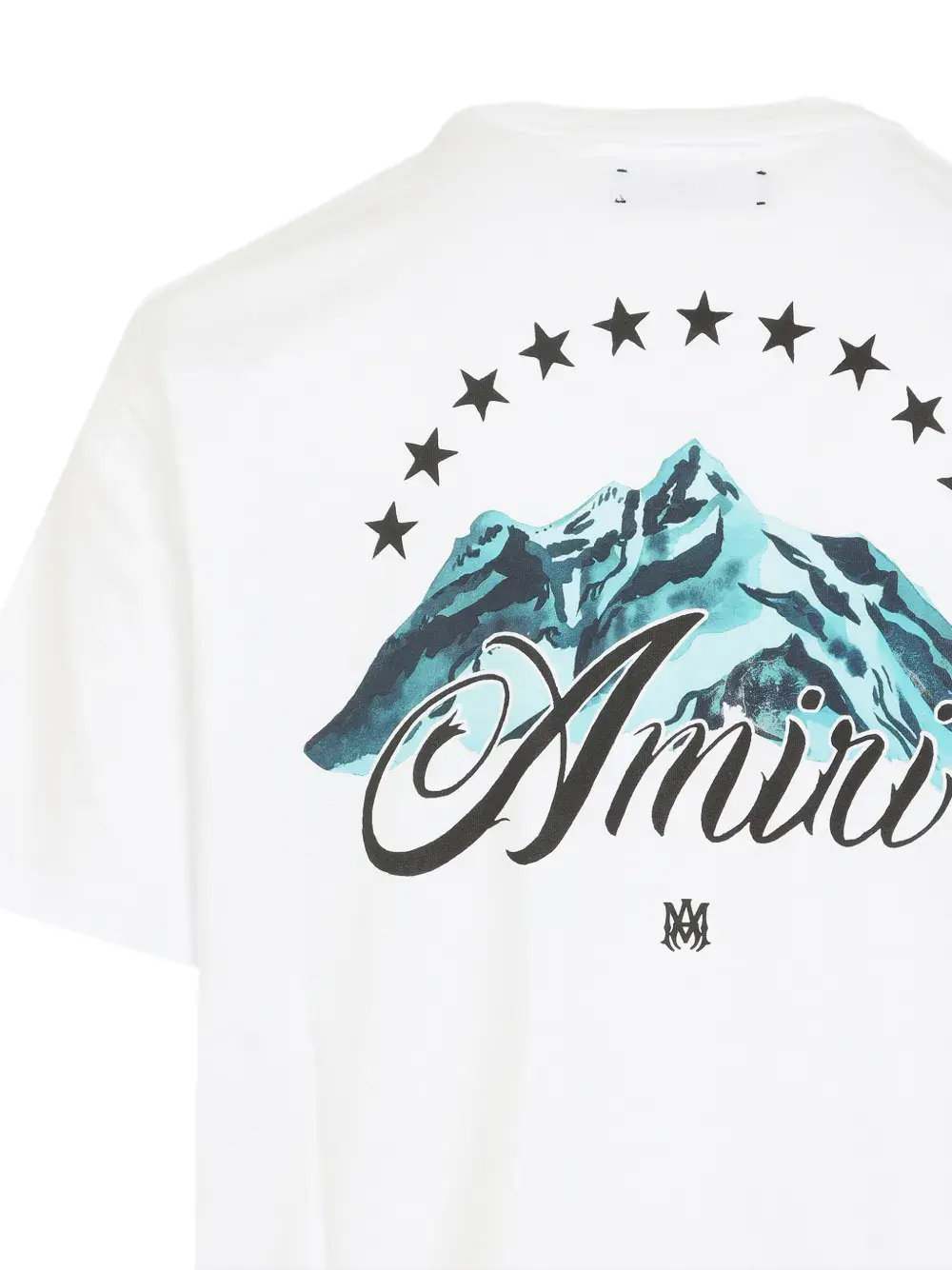белая футболка с графическим принтом, круглым вырезом, короткими рукавами и логотипом