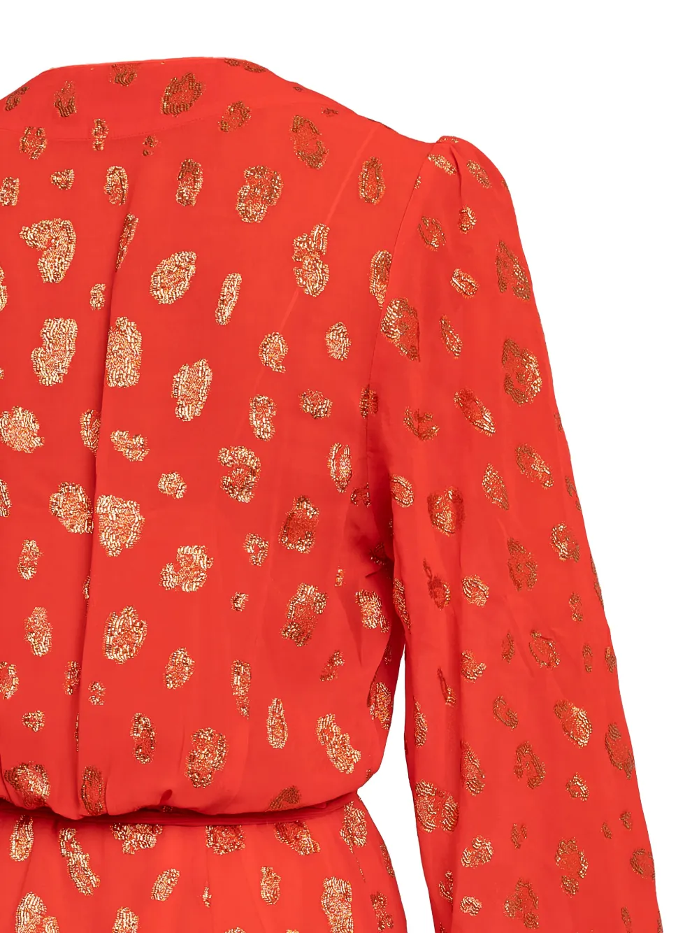 красное платье с цветочным принтом, V-образным вырезом, поясом на талии, длинными рукавами и расклешёнными рукавами