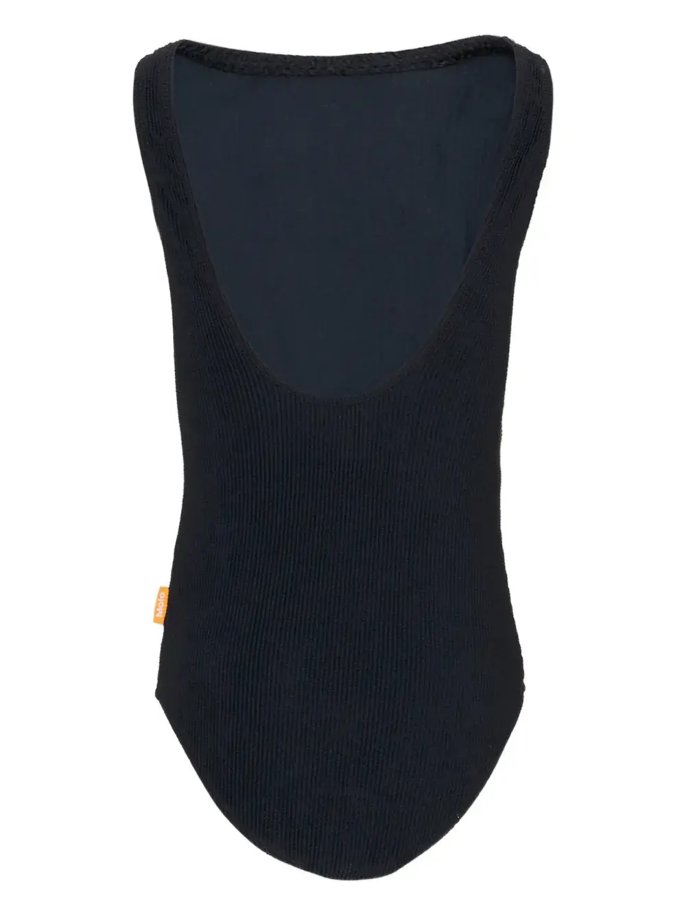черный, с ребристой текстурой, без рукавов, с круглым вырезом спереди и сзади