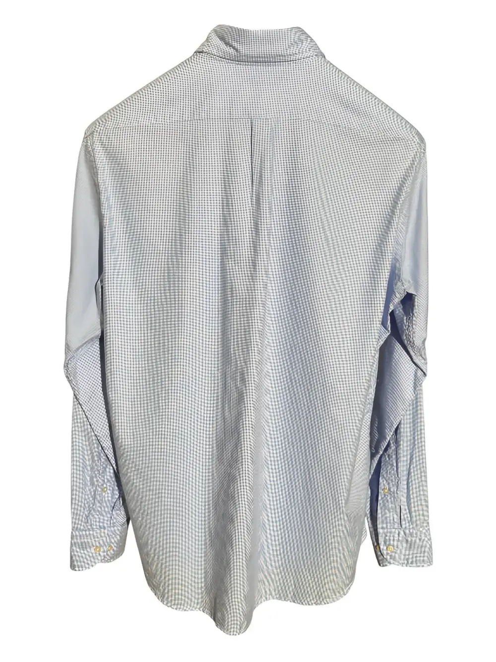 синий и белый, воротник на пуговицах, нагрудный карман, застежка на пуговицы, длинные рукава, манжеты на пуговицах