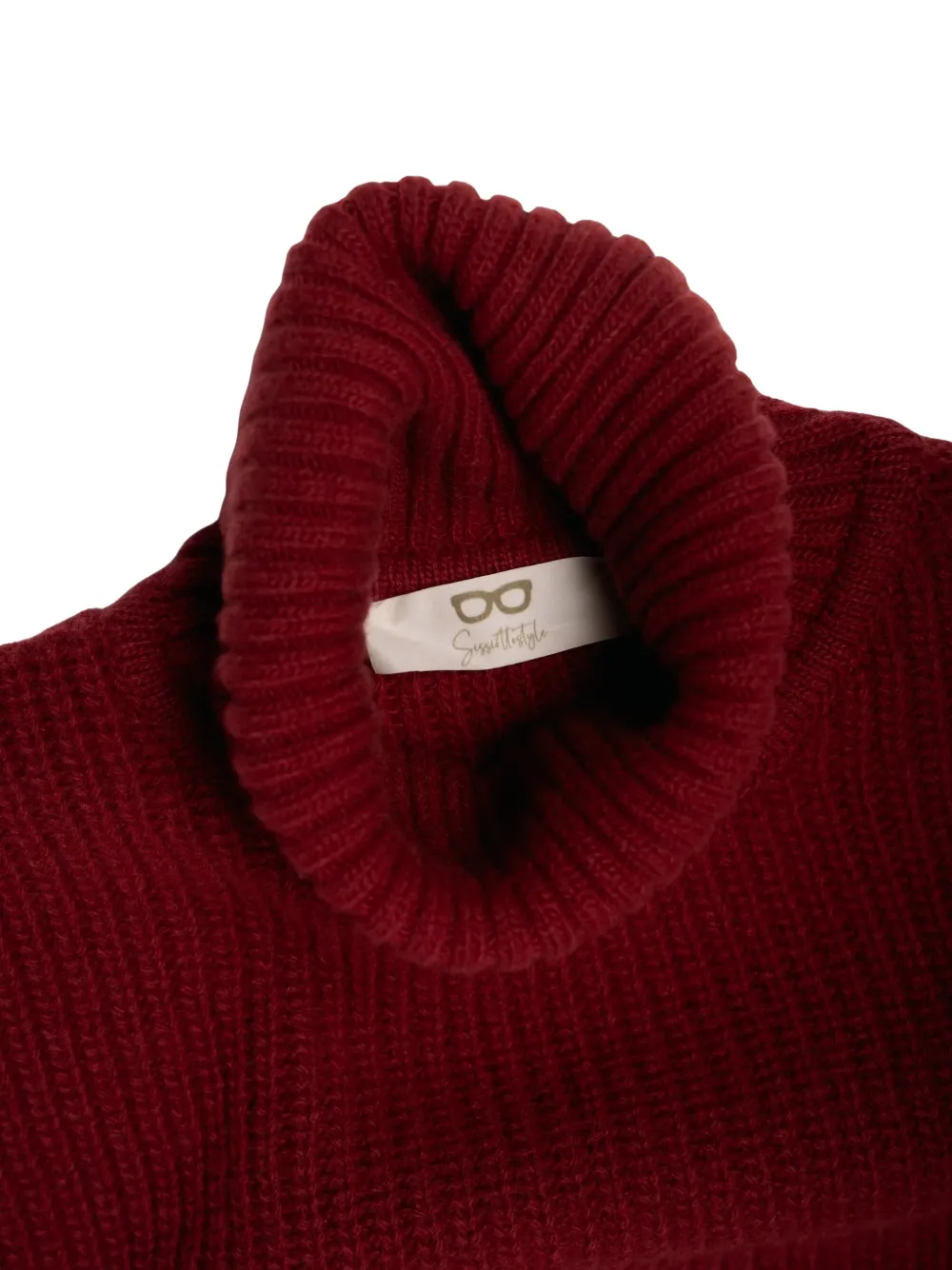 бордовый безрукавный трикотажный топ с воротником-гольф и прямым подолом в рубчик