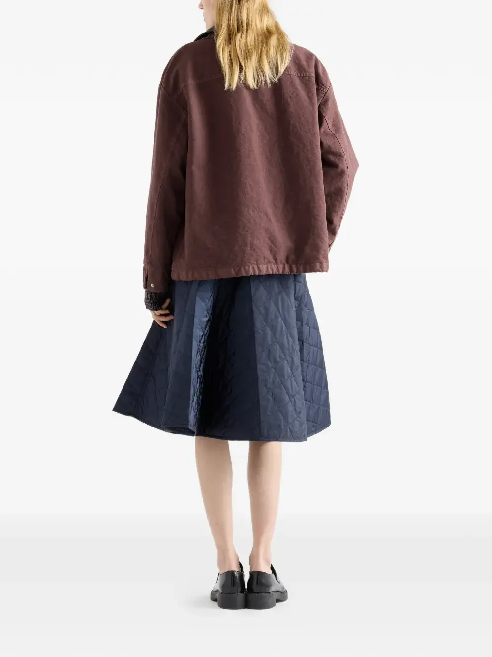 синяя стёганая вещь с металлическим логотипом-треугольником и эластичным шнурком