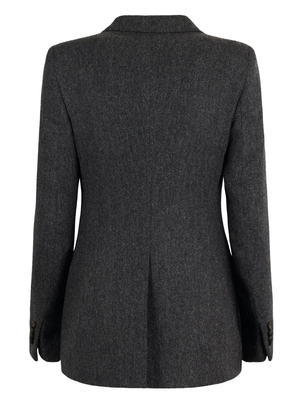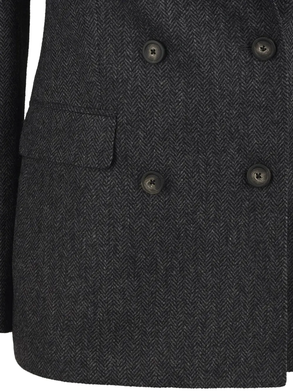темно-серый пиджак с ёлочным узором, двубортной застёжкой на пуговицы, лацканами с вырезом и клапанами на карманах