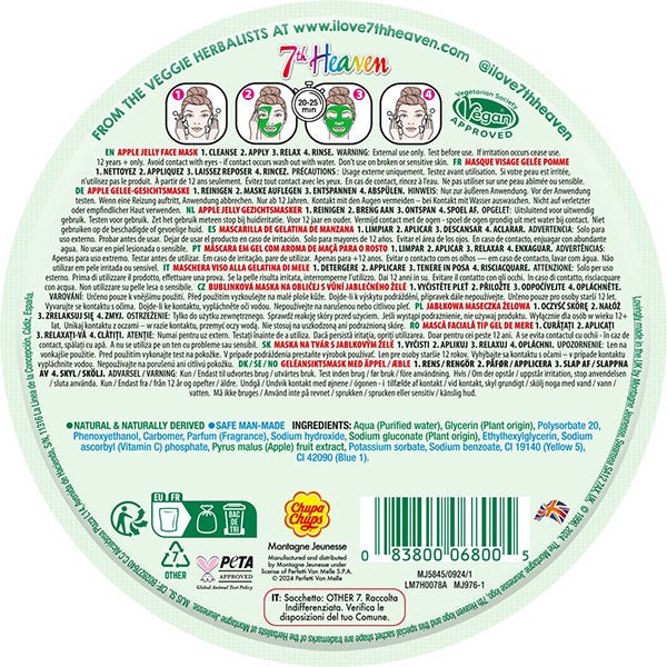 Насладитесь освежающей дозой увлажнения с нашей маской CHUPA CHUPS JELLY APPLE. Желеобразная текстура, тающая на коже, мягко питает, смягчает и освежает. Содержит осветляющий витамин С, который помогает осветлить тусклую кожу, а также уменьшает видимость мелких морщин, пигментацию и текстуру кожи.
