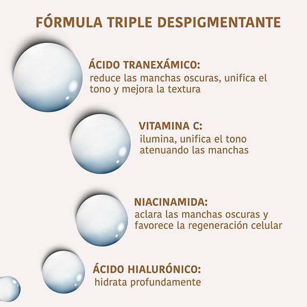 Транексамовая кислота подавляет воспалительные пути, способствующие гиперпигментации, блокируя активность меланоцитов (клеток, продуцирующих меланин), тем самым уменьшая количество меланина и осветляя темные пятна. Ниацинамид дополняет этот эффект, блокируя перенос меланосом на поверхность кожи, тем самым снижая уровень меланина, достигающего поверхности, и осветляя темные пятна. Витамин С действует как мощный антиоксидант, ингибируя тирозиназу, фермент, отвечающий за синтез меланина.