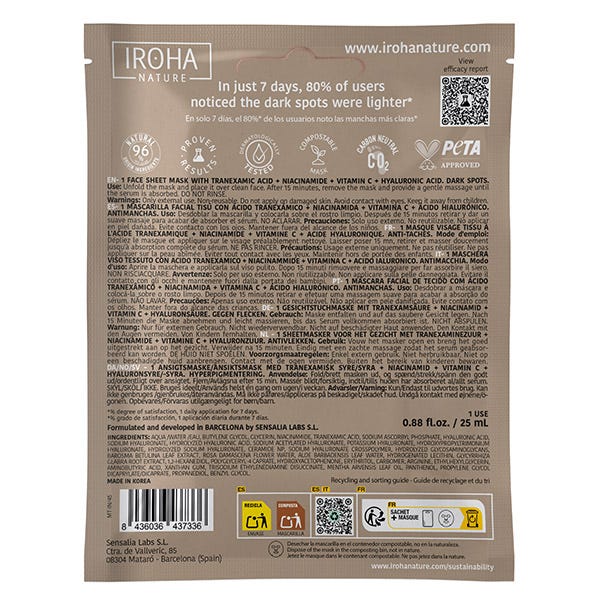 Маска против темных пятен, на 96% состоящая из натуральных ингредиентов, оказывает тройной депигментирующий эффект благодаря своей формуле с транексамовой кислотой, ниацинамидом и витамином С. Эти активные ингредиенты подавляют различные пути, способствующие гиперпигментации, предотвращая и уменьшая темные пятна на лице.