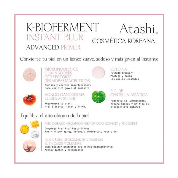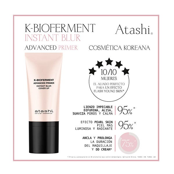 Atashi K-Bioferment Instant Blur Advanced Primer 50 мл — это невидимый многофункциональный праймер, который маскирует недостатки, выравнивает тон кожи, сужает поры, пятна, следы от прыщей, уменьшает нежелательный блеск и глубокие морщины.