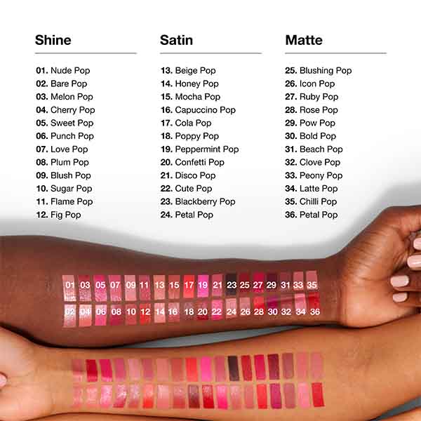 • Идеально подходит для любых губ благодаря широкому выбору оттенков, подходящих к любому тону кожи, и 3 различным финишам, которые помогут вам воссоздать любой образ.