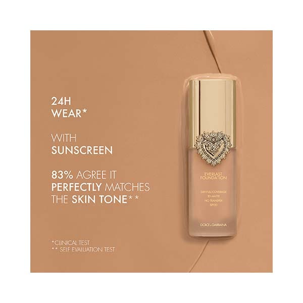 Тональная основа Everlast выпускается в красивом стеклянном флаконе с золотой крышкой, запечатанной культовым Священным Сердцем Dolce&Gabbana.