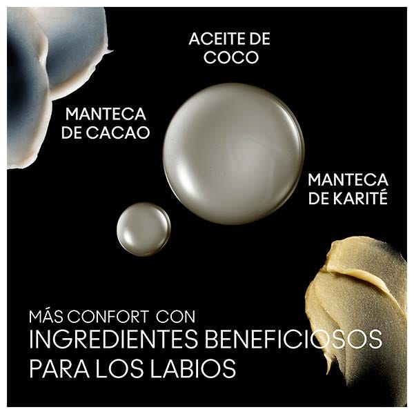 Получите БОЛЬШЕ КОМФОРТА с кремовой смесью кокосового масла, органического масла ши и органического масла какао, которая кондиционирует и питает ваши губы.