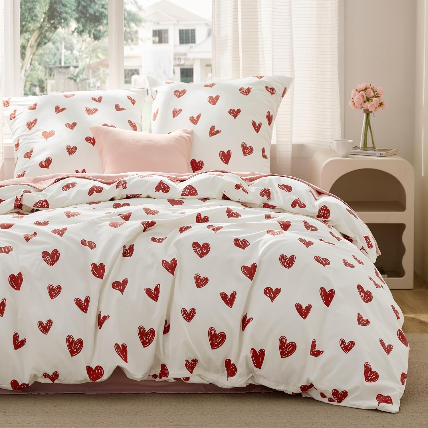 Современный дизайн: Этот двусторонний комплект пододеяльников с освежающим узором в виде красных сердец придаст вашей спальне элегантный вид.