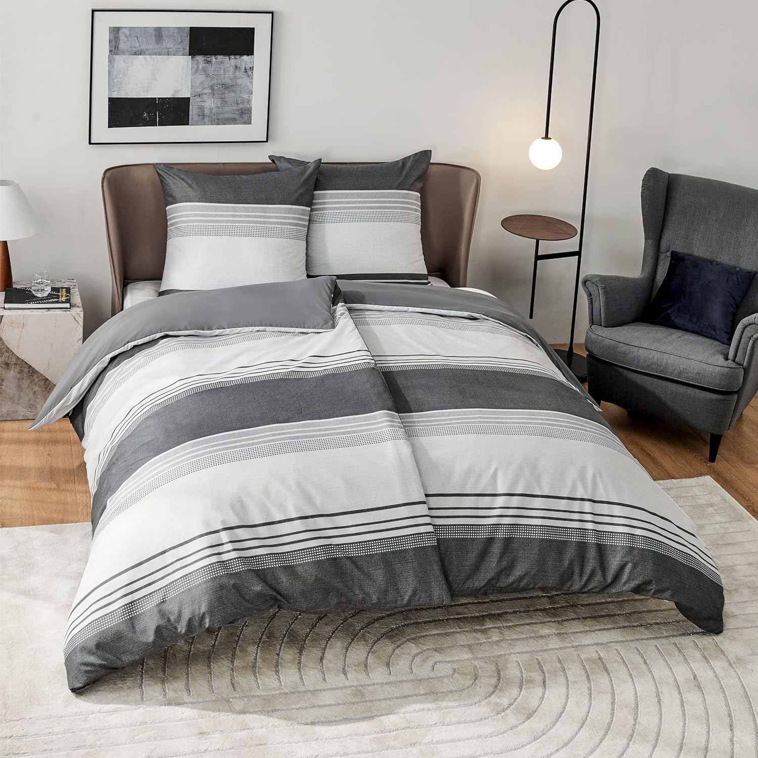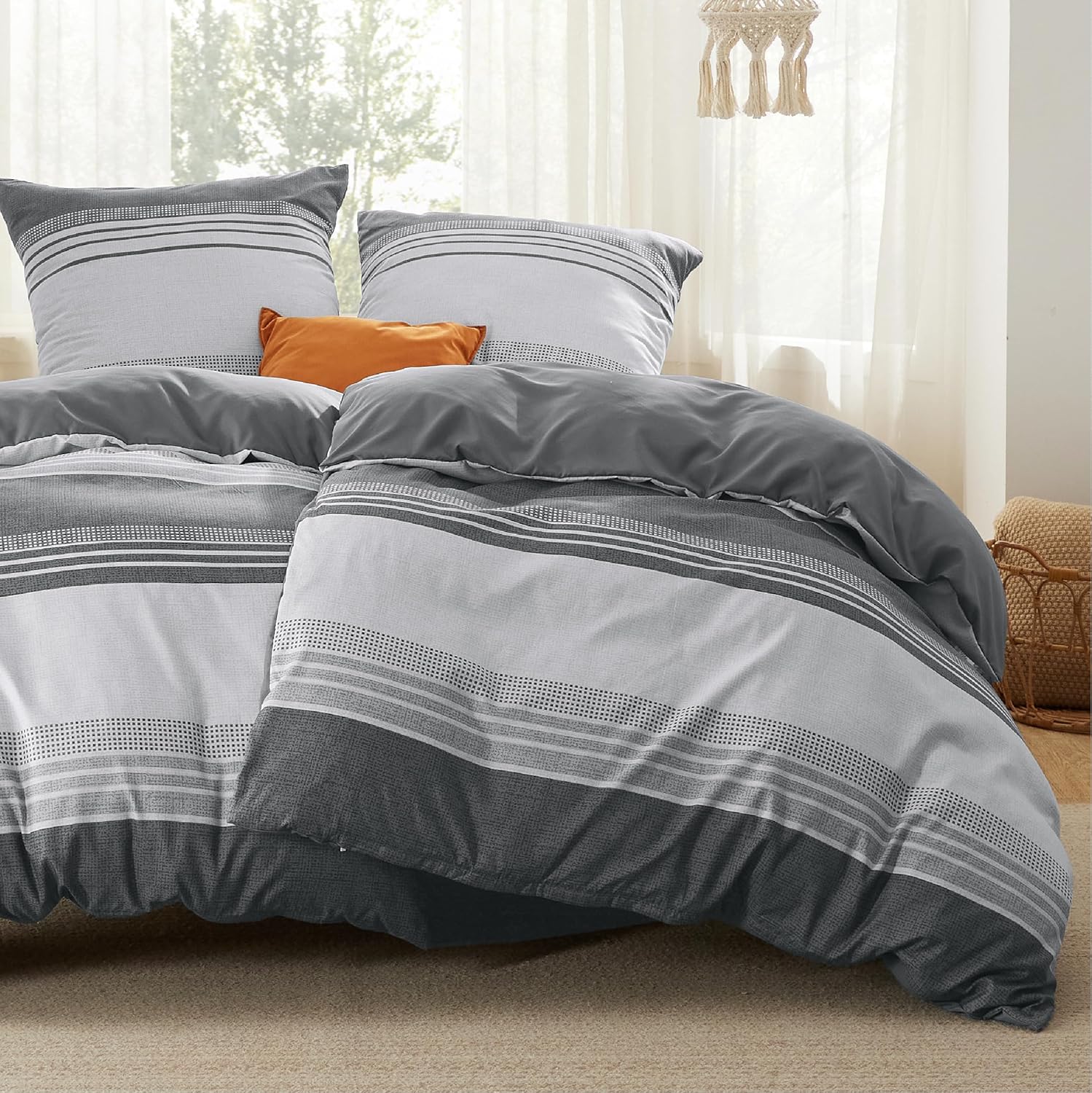 Наволочки и серое постельное белье размером 135 х 200 см оснащены молниями, что позволяет легко надевать и снимать их.