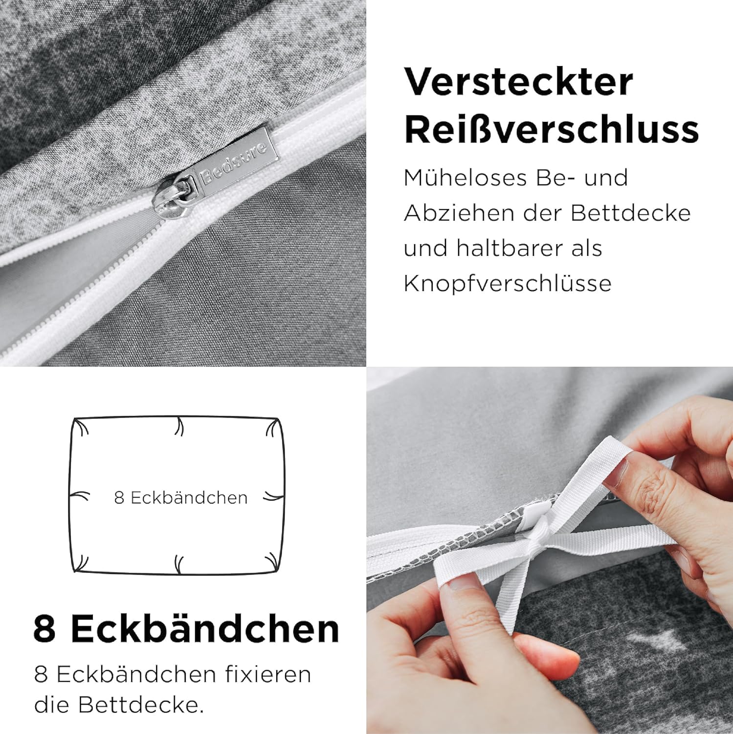 Каждый комплект постельного белья размером 135 х 200 см имеет 8 вшитых практичных завязок, которые удерживают одеяло и мягкое белье вместе, не давая чехлу соскользнуть.