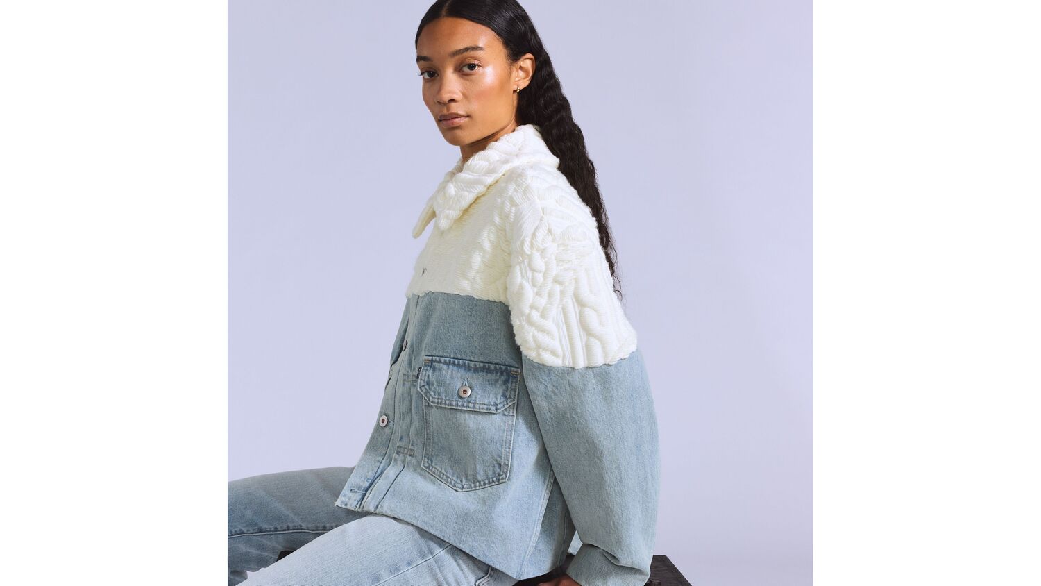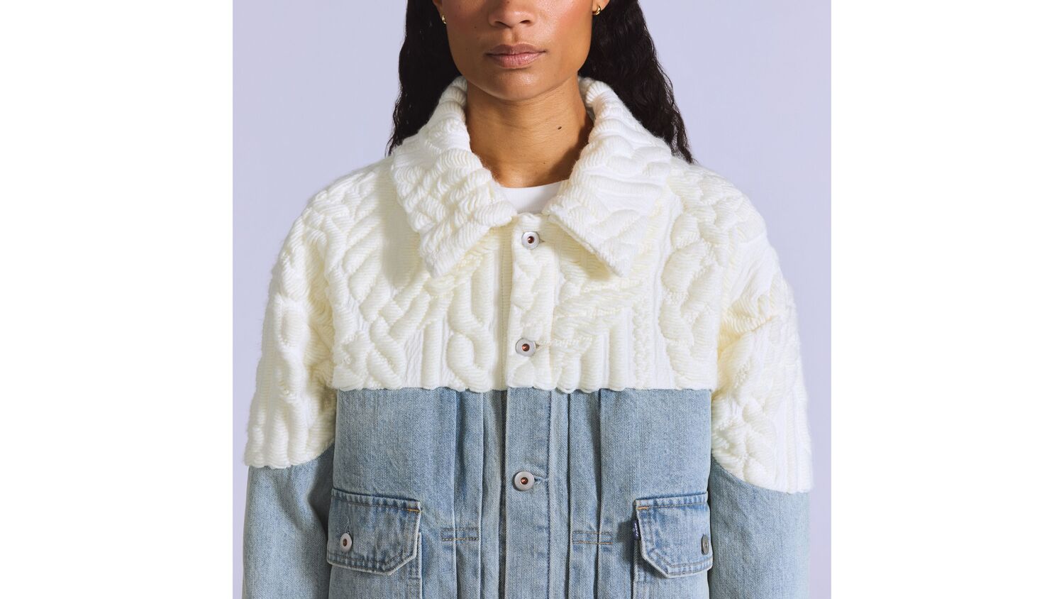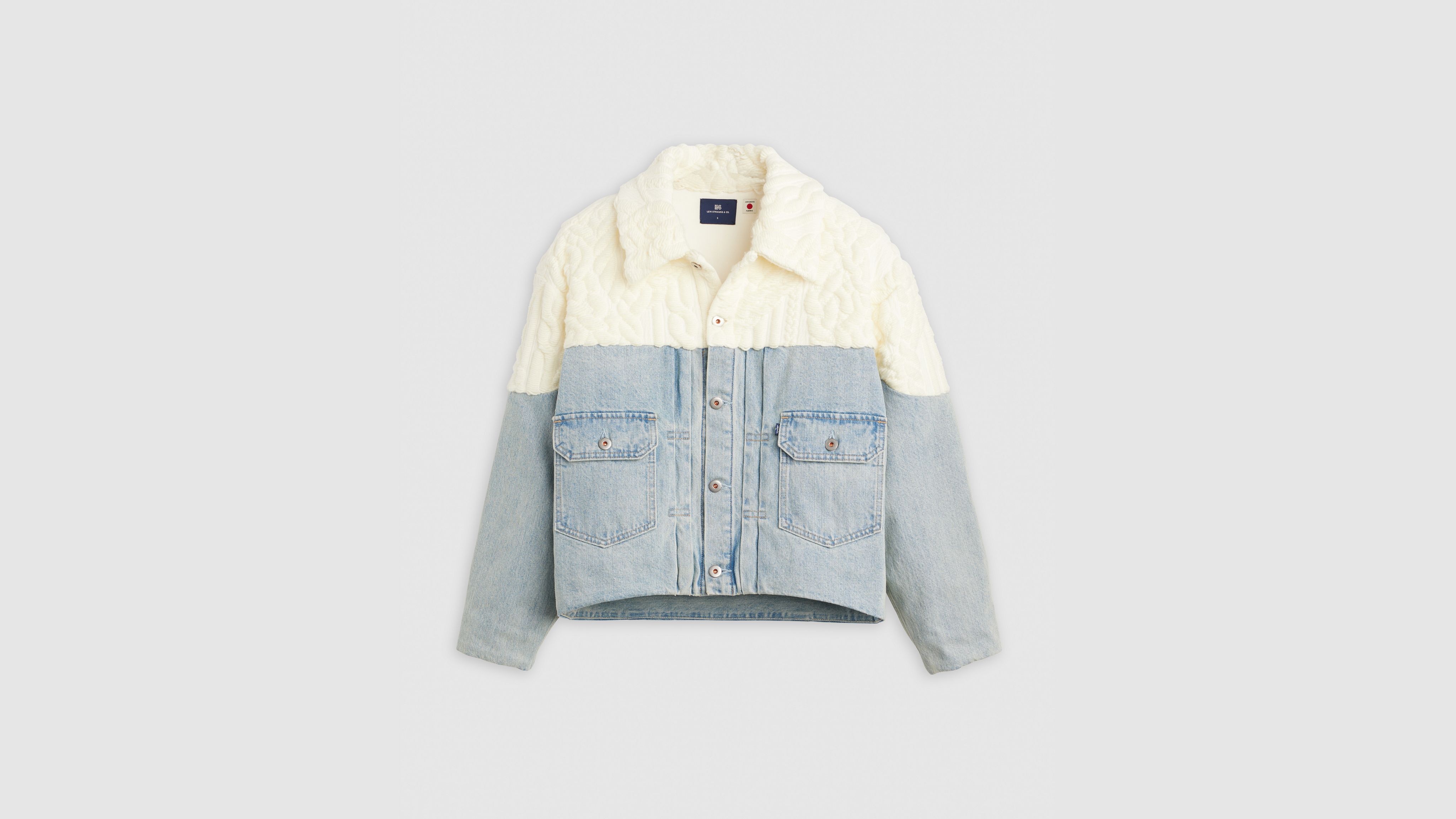 Частично свитер, частично куртка. Наша куртка Aran Trucker Jacket выполнена из вязаного жгута сверху и джинсовой ткани снизу, что дополняется непринужденным и свободным кроем.