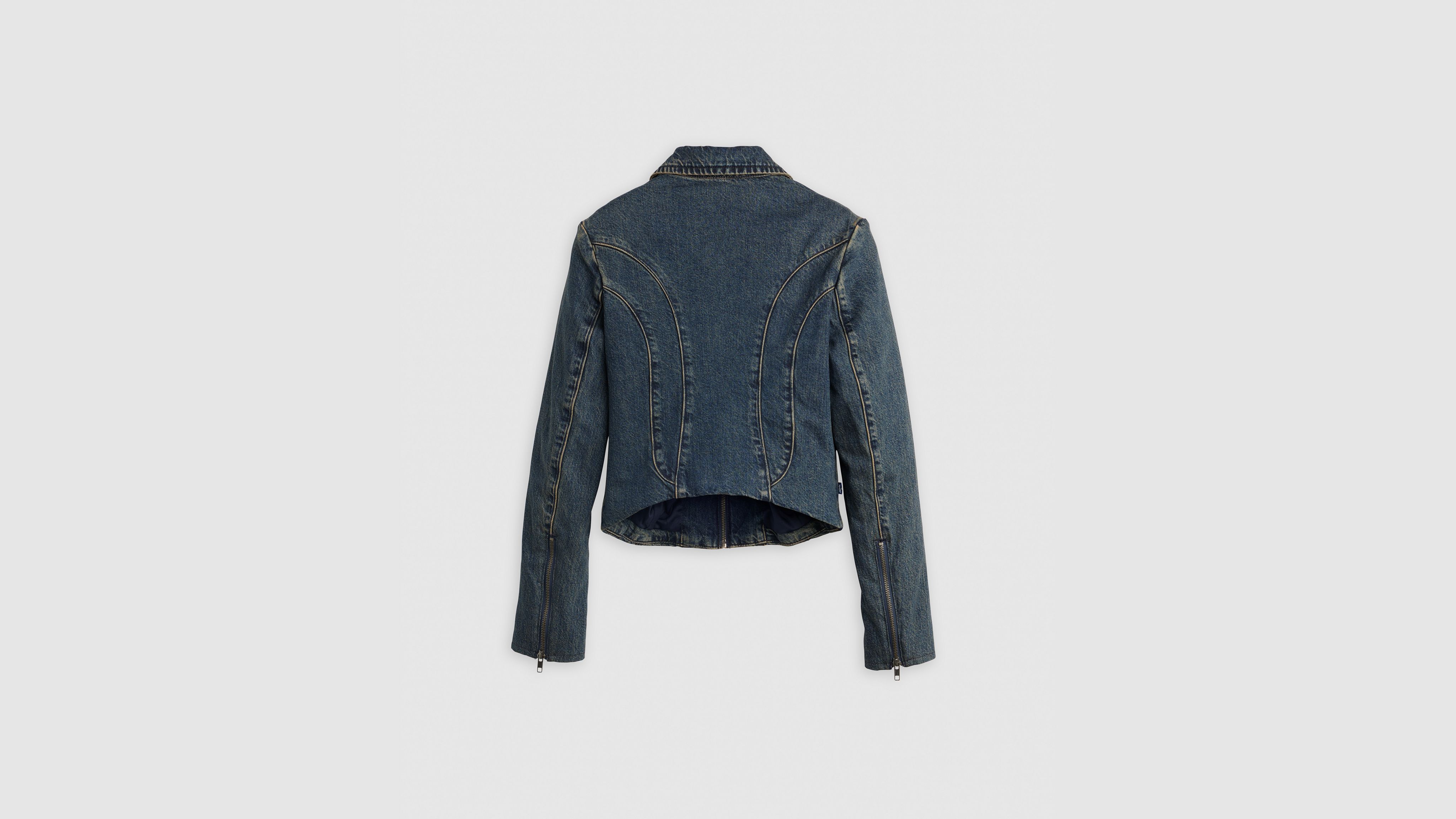 Наша байкерская куртка с ультратонким кроем, подчеркивающим фигуру, отличается декоративными швами и классической застёжкой на молнии.