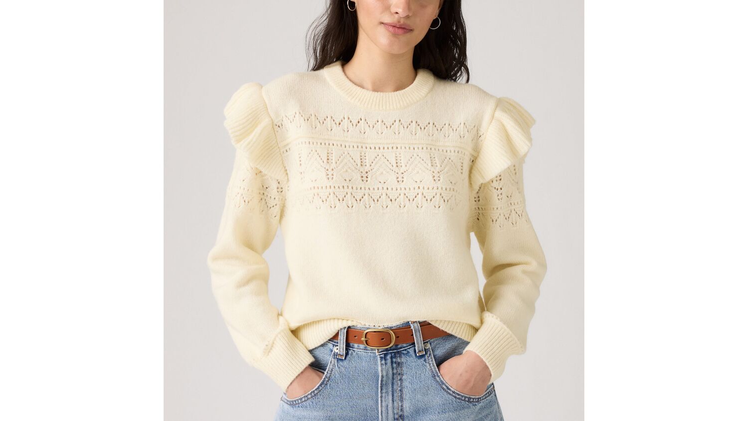 Преобразите свой повседневный свитер с помощью нашего свитера Shane Flutter Sleeve Sweater Cut с удобной стандартной посадкой, вышитыми деталями и оборками на рукавах.