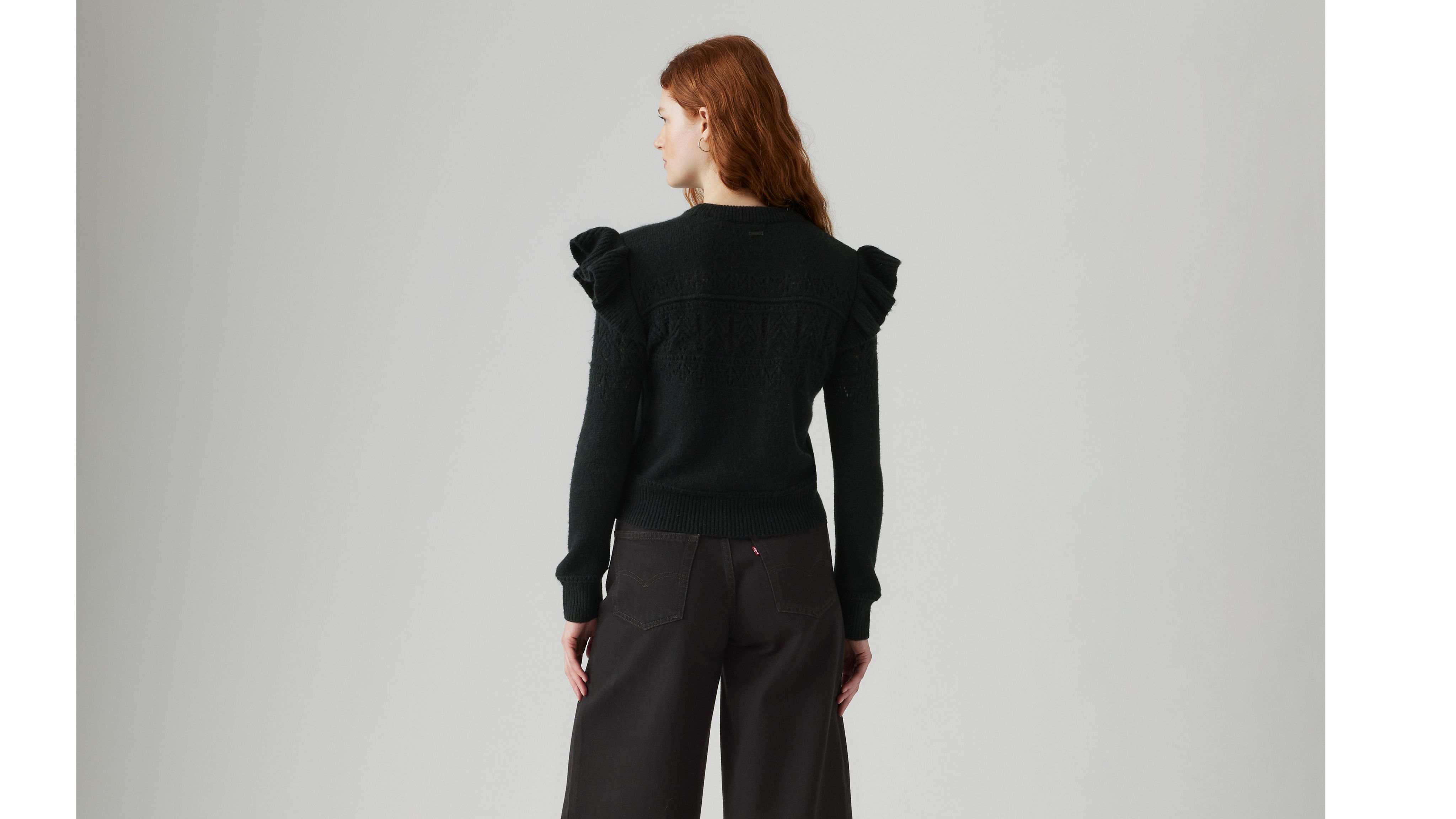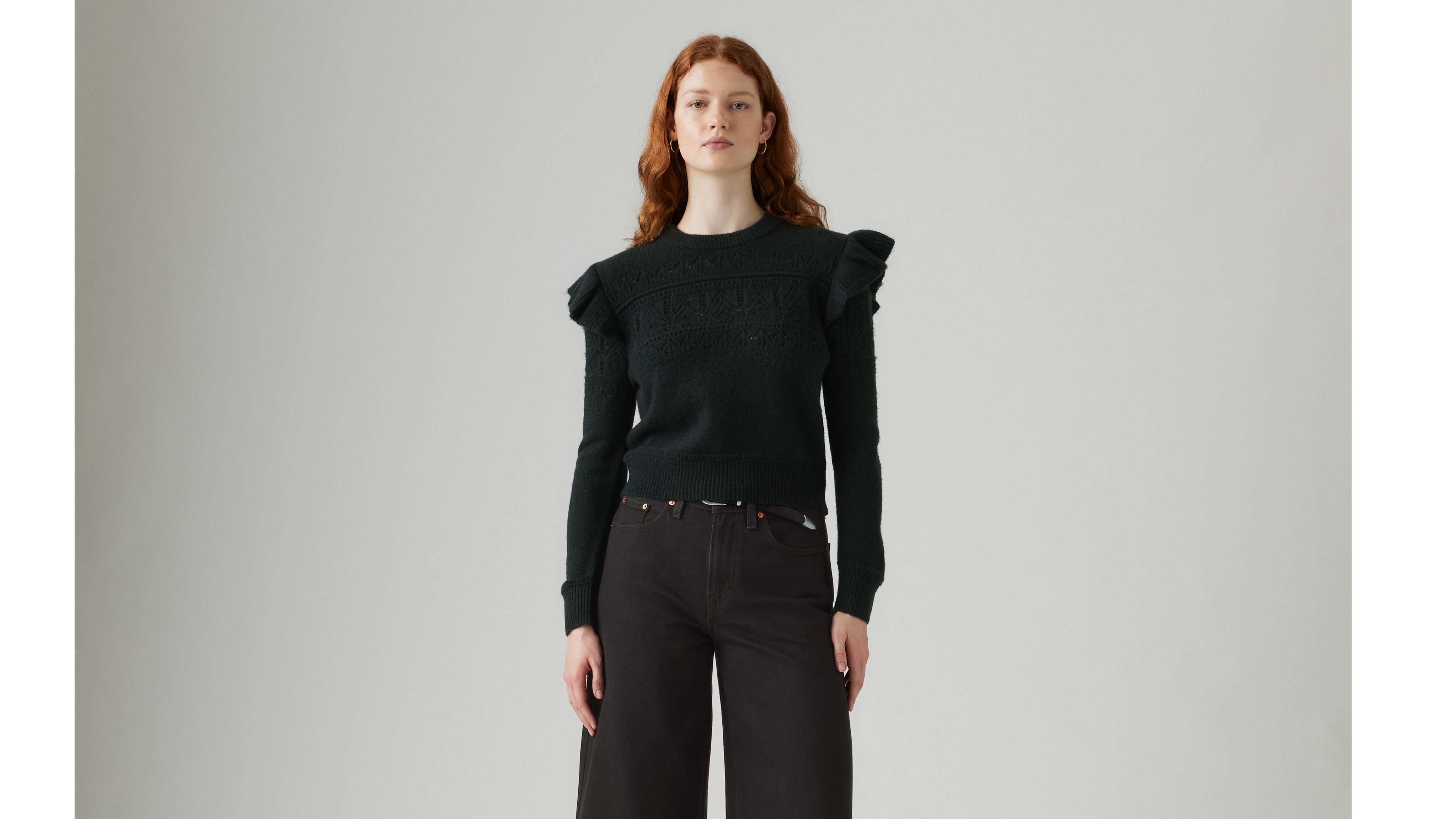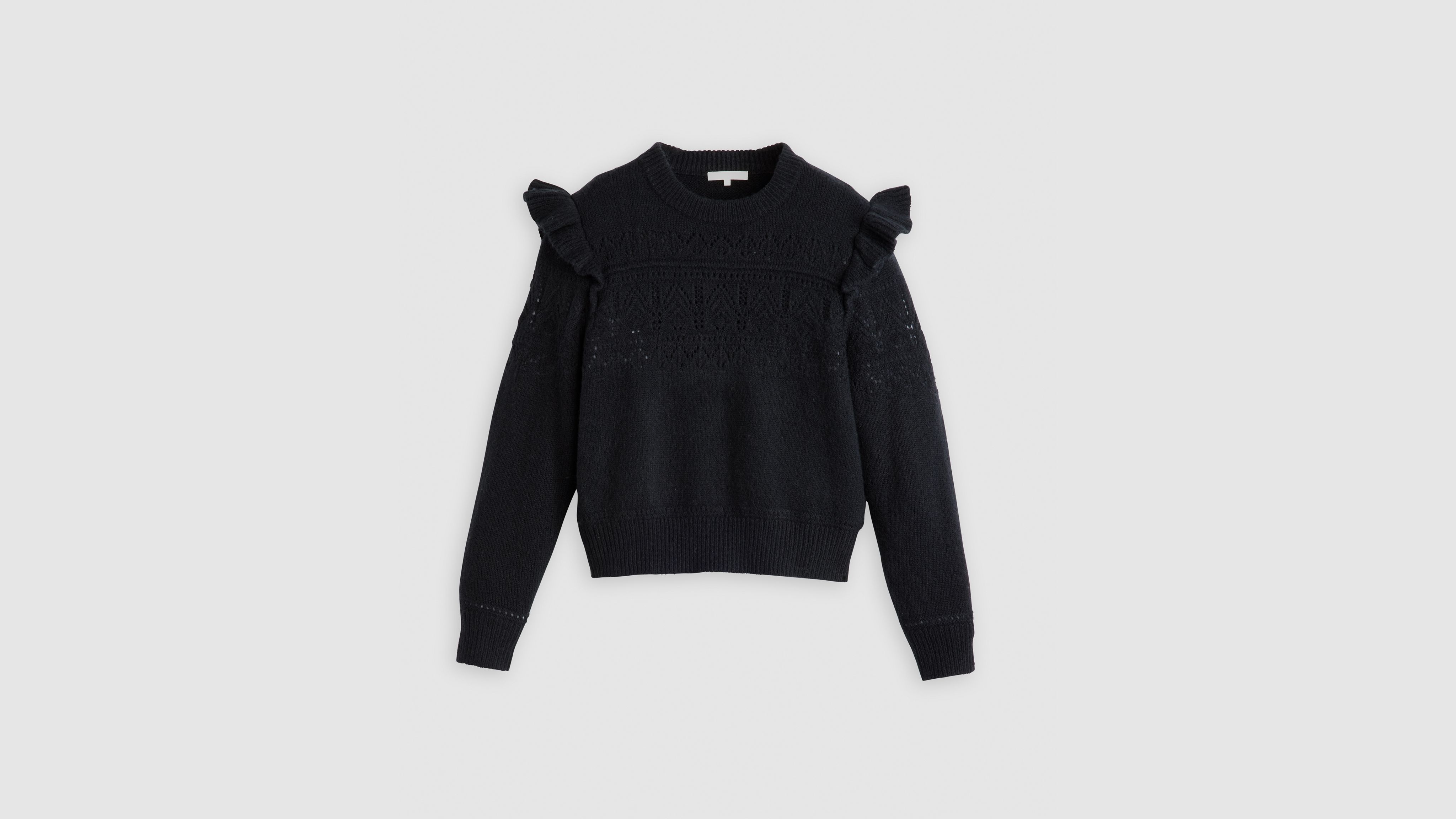 Преобразите свой повседневный свитер с помощью нашего свитера Shane Flutter Sleeve Sweater Cut с удобной стандартной посадкой, вышитыми деталями и оборками на рукавах.