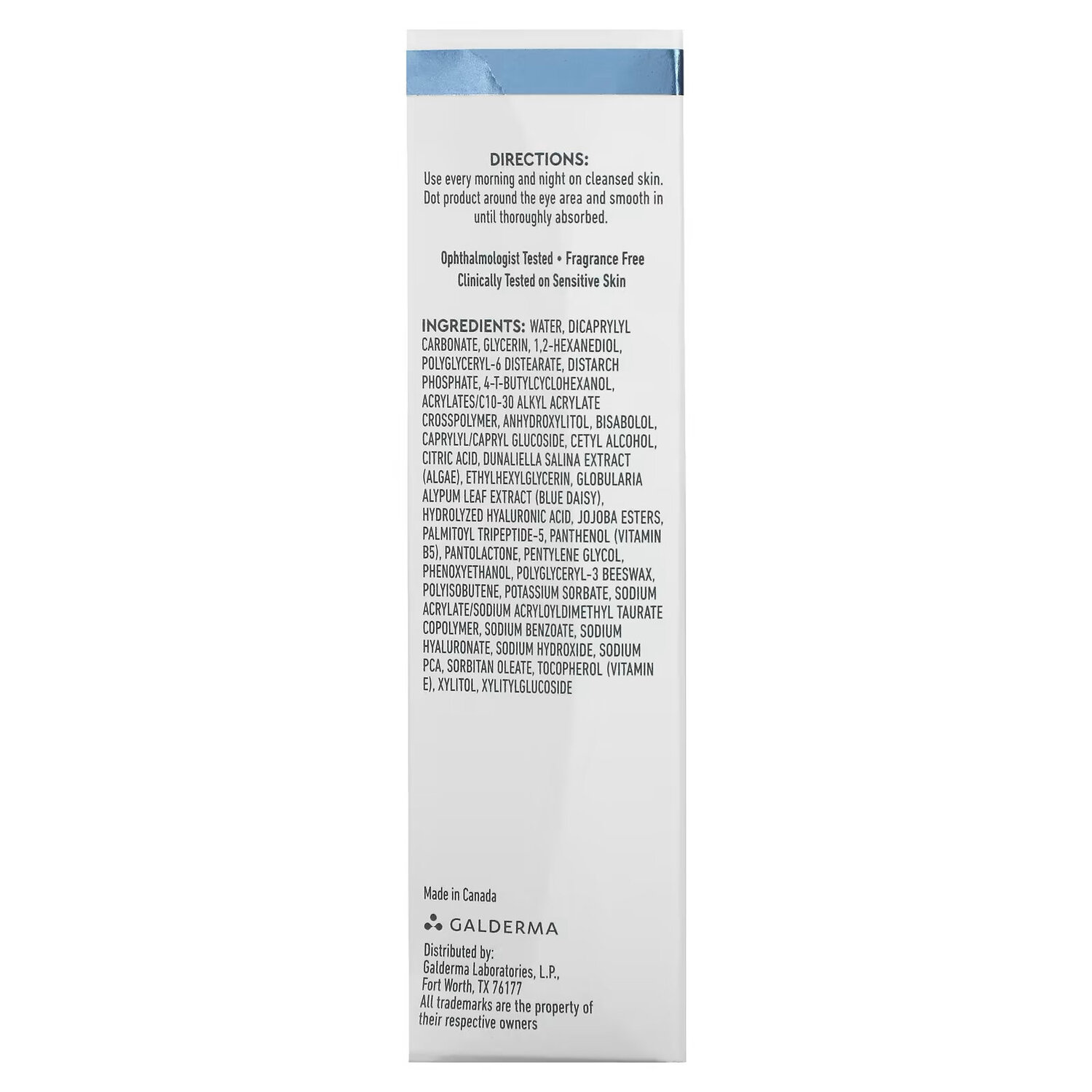Вода, дикаприлил карбонат, глицерин, 1,2-гександиол, полиглицерил-6 дистеарат, дикрахмалфосфат, 4-т-бутилциклогексанол, акрилат/c10-30 алкил акрилат кроссполимер, ангидроксилитол, бисаболол, каприлил/каприл глюкозид, цетиловый спирт, лимонная кислота, экстракт водорослей dunaliella salina, этилгексилглицерин, экстракт листьев голубой ромашки (globularia alypum), гидролизованная гиалуроновая кислота, эфиры жожоба, пальмитоил трипептид-5, пантенол (витамин B5), пантолактон, пентилен гликоль, феноксиэтанол, полиглицерил-3 пчелиный воск, полиизобутен, сорбат калия, натрия акрилат/натрия акрилоилдиметил таурат сополимер, бензоат натрия, гиалуронат натрия, гидроксид натрия, натрия пирролидонкарбонат, сорбитанолеат, токоферол (витамин E), ксилитол, ксилитилглюкозид.