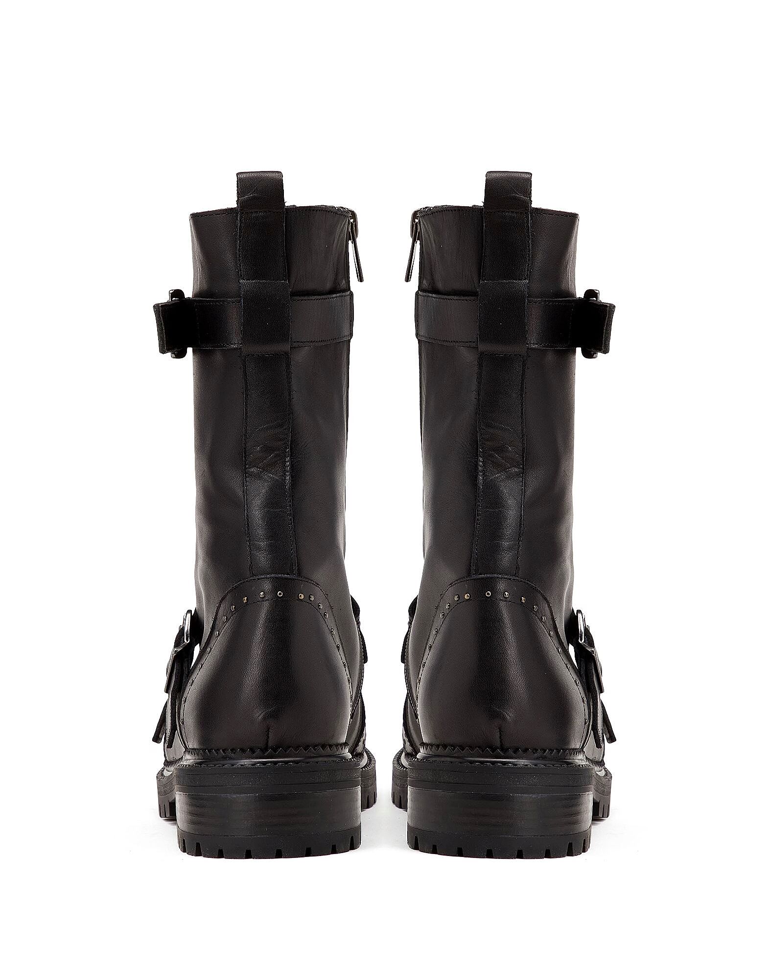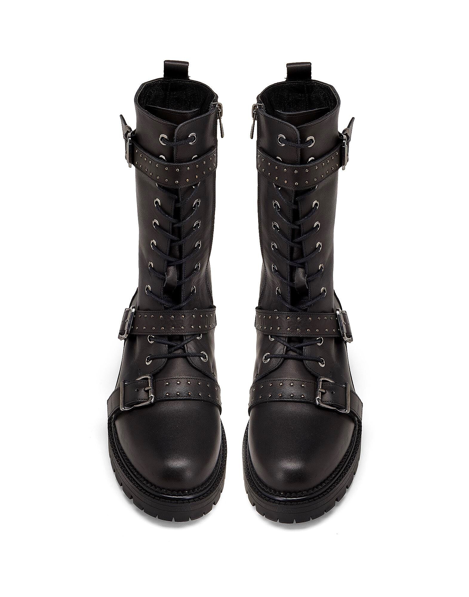 Эти кожаные армейские ботинки с двумя ремнями и регулируемыми металлическими пряжками. Доступны в однотонном варианте, имеют резиновую рифленую подошву, шнуровку и боковую застежку-молнию.