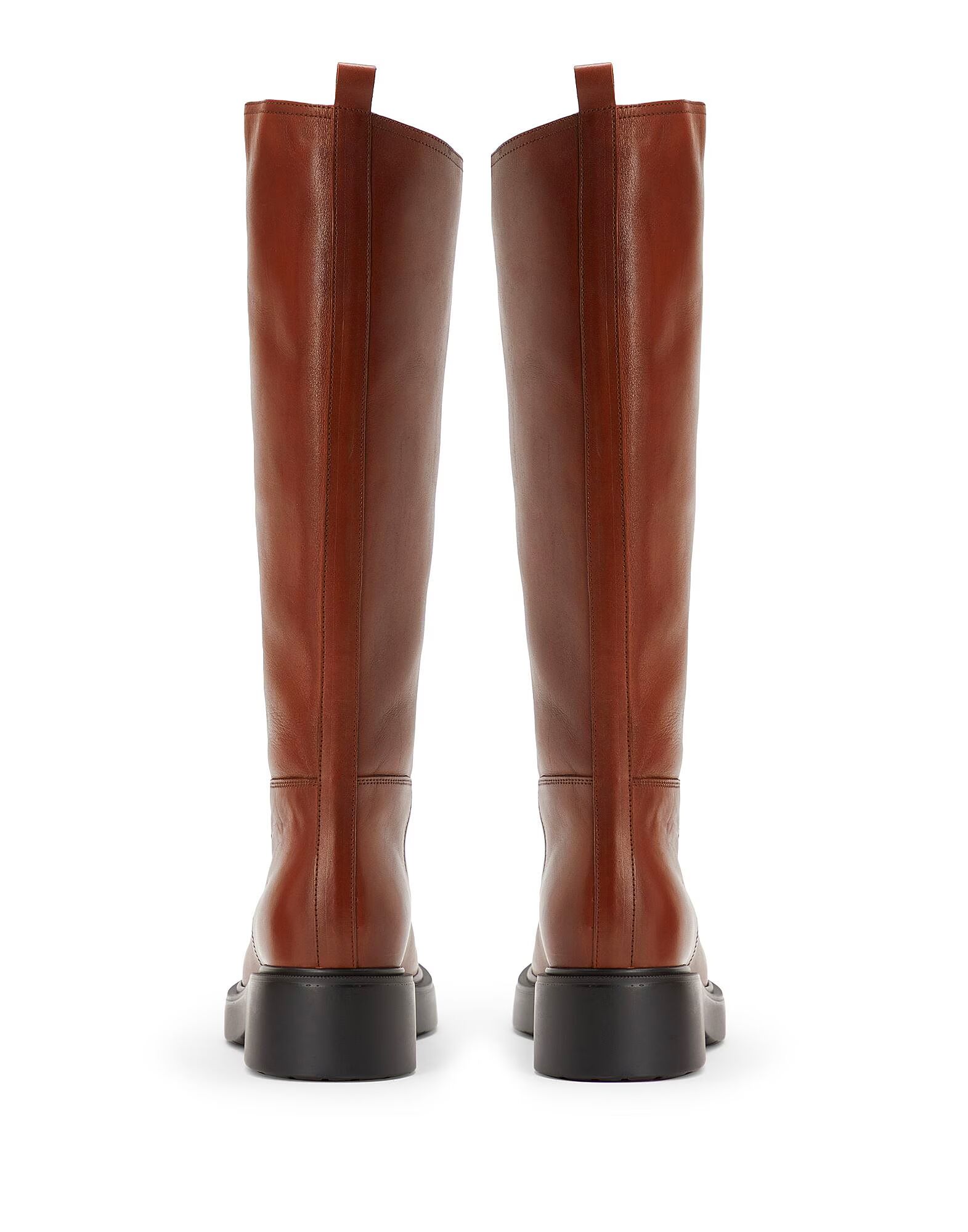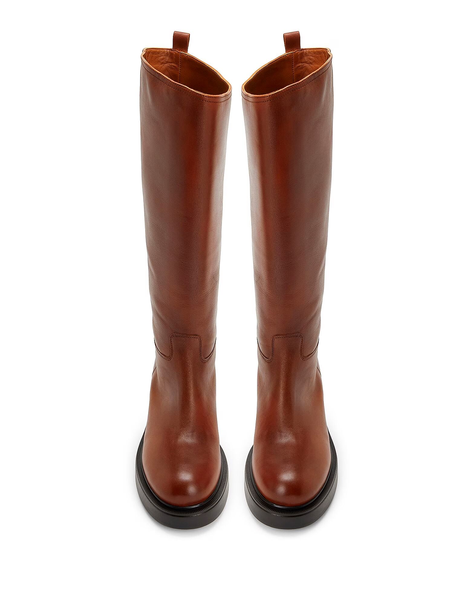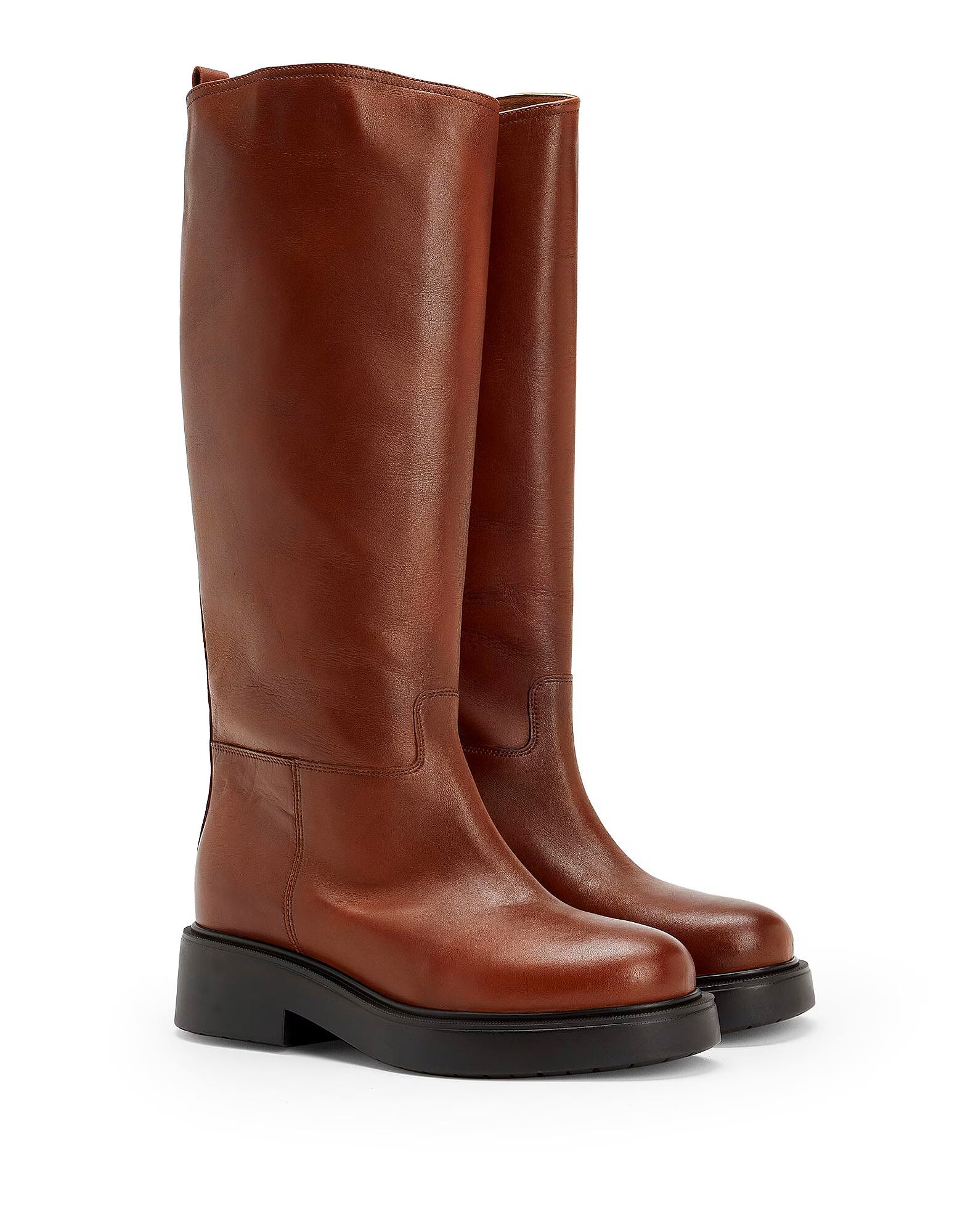 Эти однотонные кожаные сапоги длиной ниже колена с круглым носком сделаны в Италии и дополнены плоской резиновой подошвой.