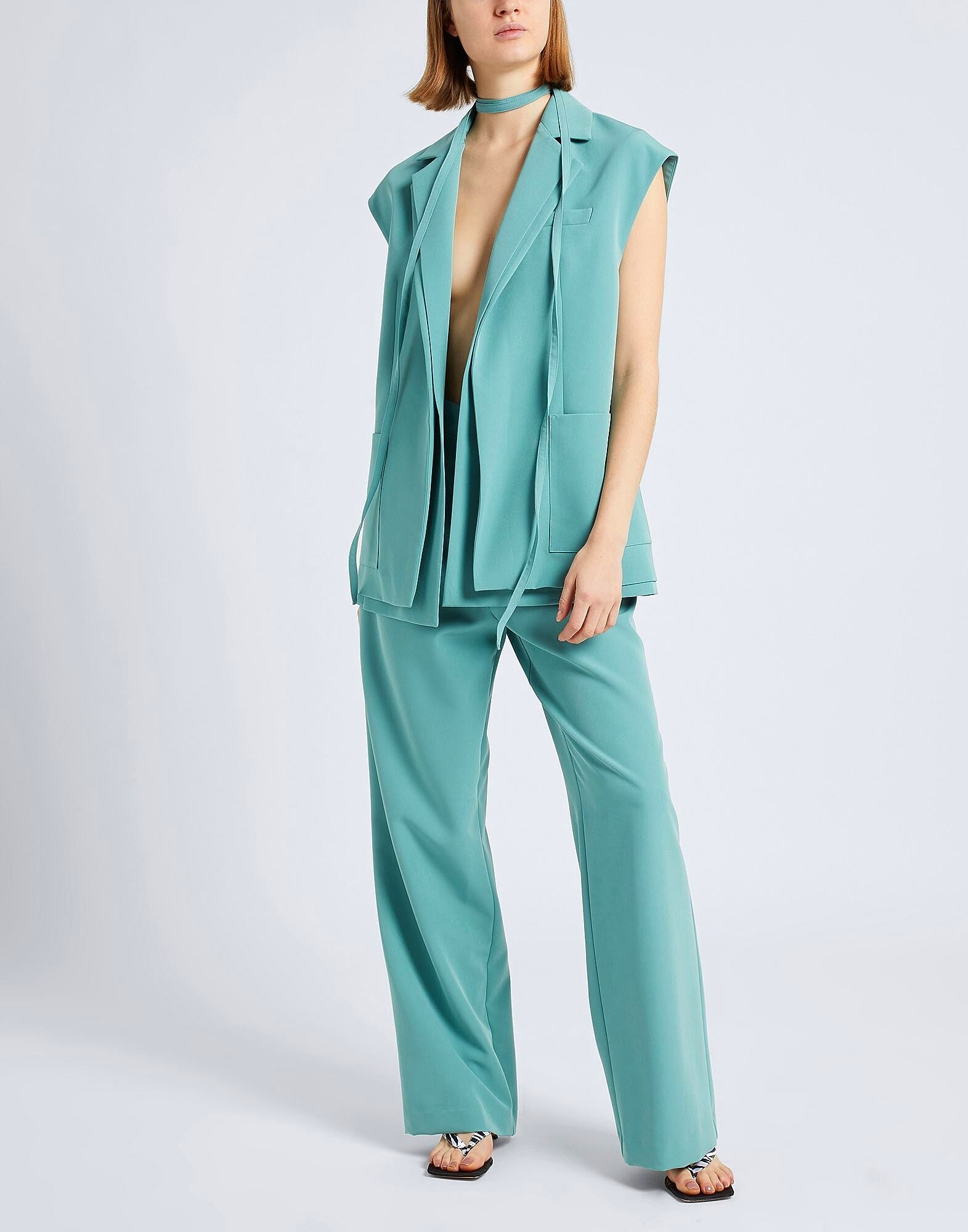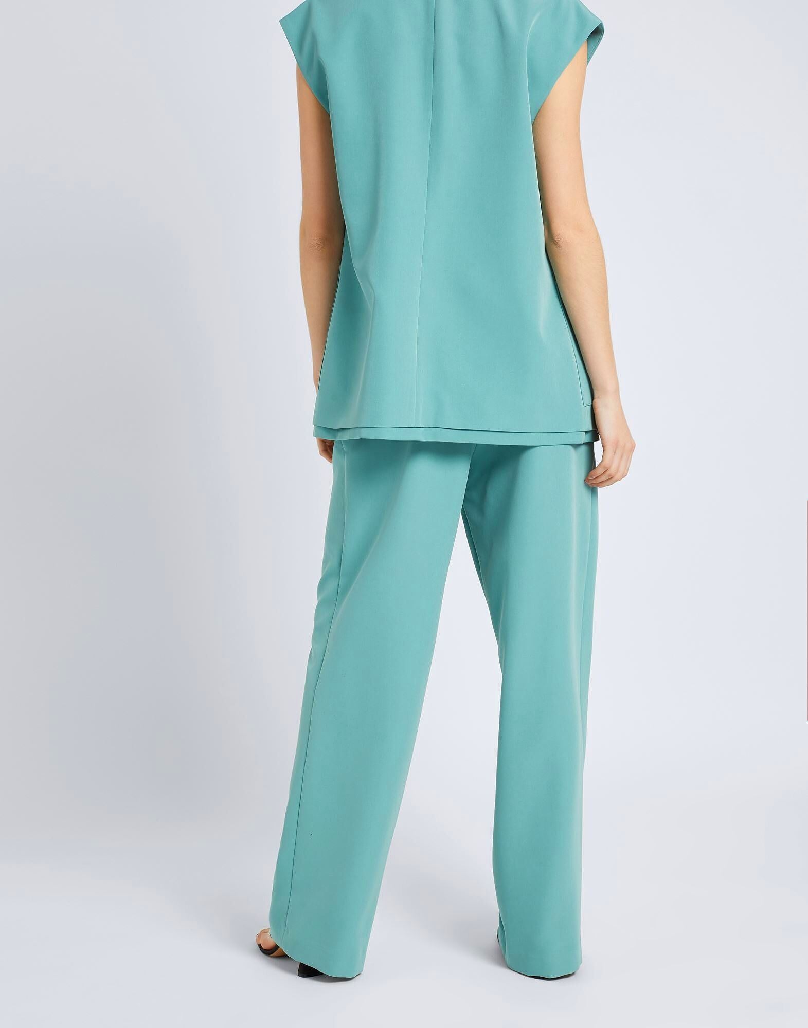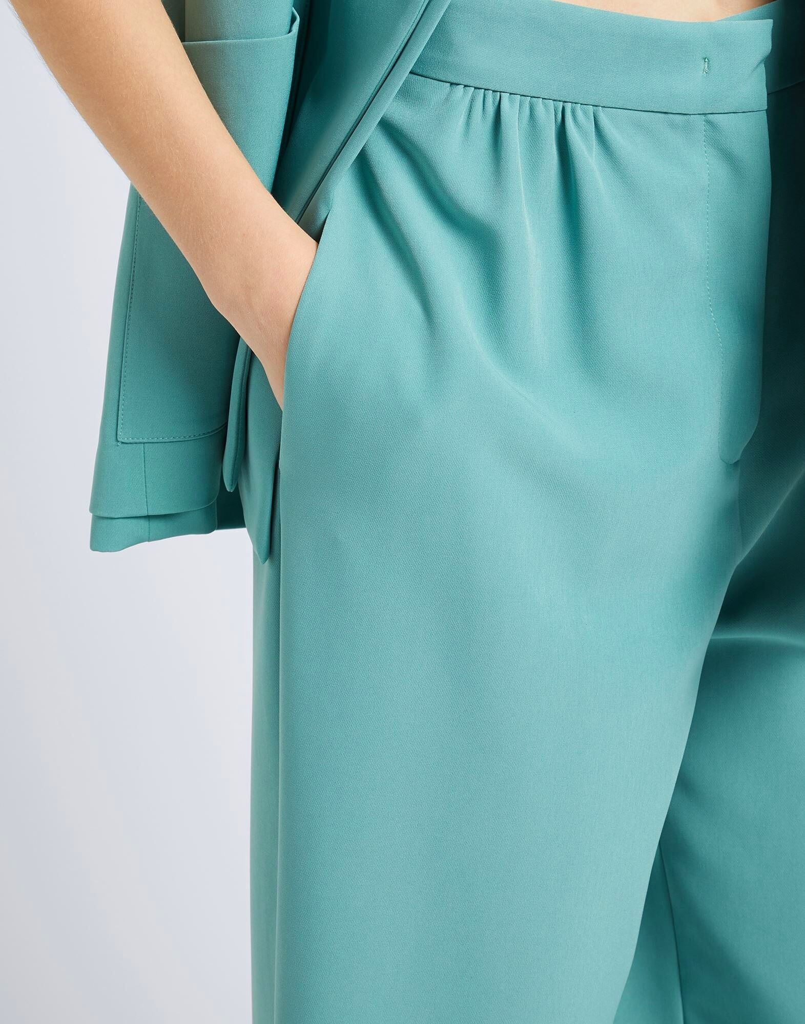 Эти брюки итальянского производства из однотонного твила имеют приталенный крой с широкими штанинами. Высокая талия, без подкладки, застёжка на молнию и большие карманы. На модели представлен итальянский размер S/40.