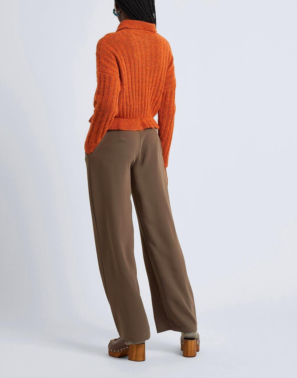Однотонные креповые брюки с высокой талией, прямым кроем и слегка свободным кроем. Сделаны в Италии. Характерные особенности: диагональная застежка на молнию и пуговицу, а также два боковых кармана. Этот предмет одежды изготовлен из материалов, сертифицированных ReLiveTex, в рамках циклической модели утилизации неликвидных текстильных изделий итальянских производителей. Благодаря прозрачности и отслеживаемости процессов, эта экологическая сертификация подтверждает, что материалы не превращаются в отходы и перерабатываются для нового использования. На модели надет размер S/40 (итальянский).