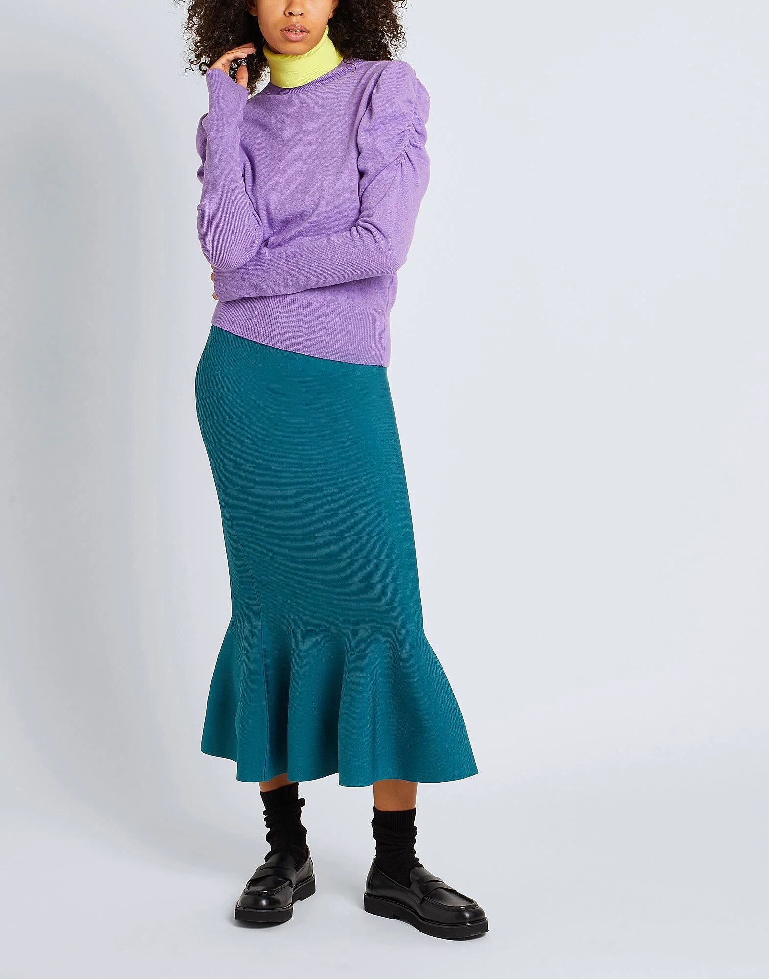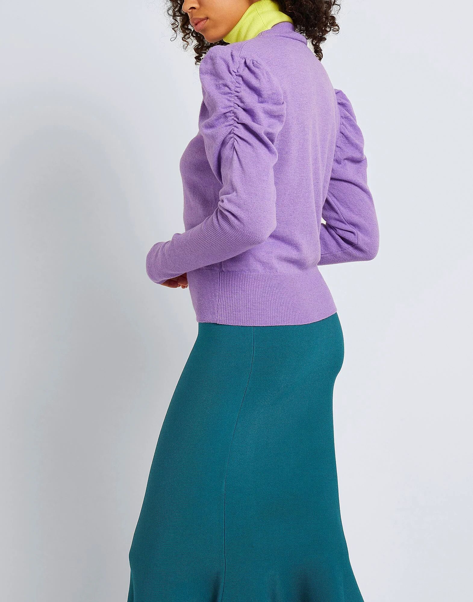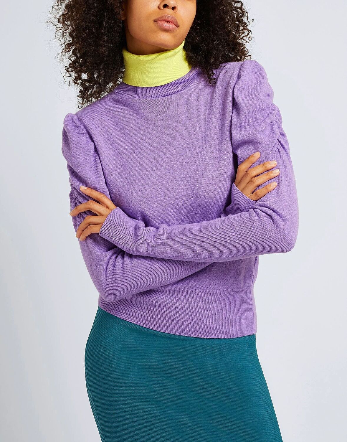 Эта однотонная водолазка, изготовленная в Италии, имеет классический высокий воротник и уникальную сборку на рукавах-буфах. Благодаря лёгкости она идеально подходит для межсезонья. На модели представлен итальянский размер S/40.