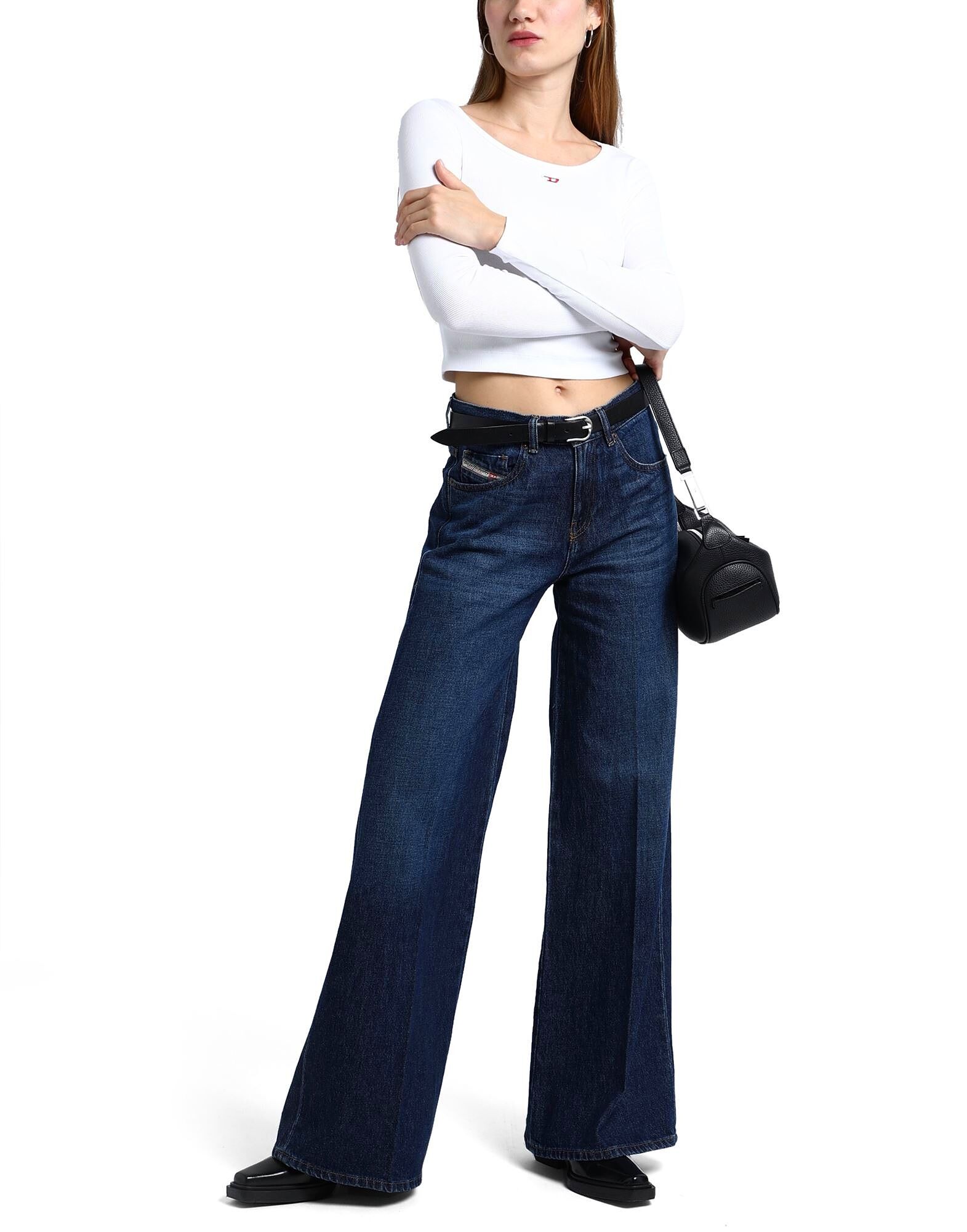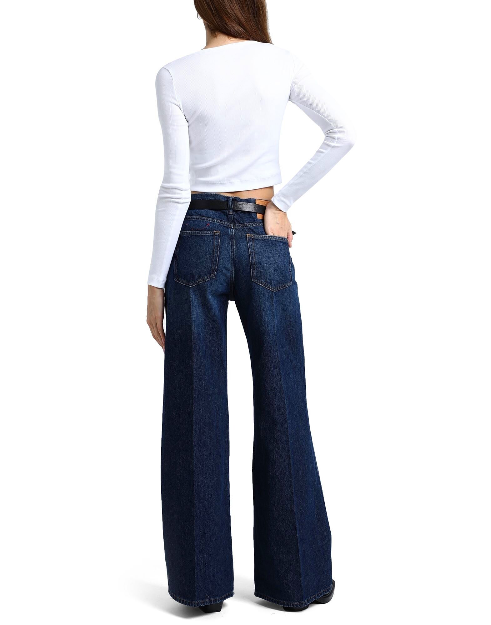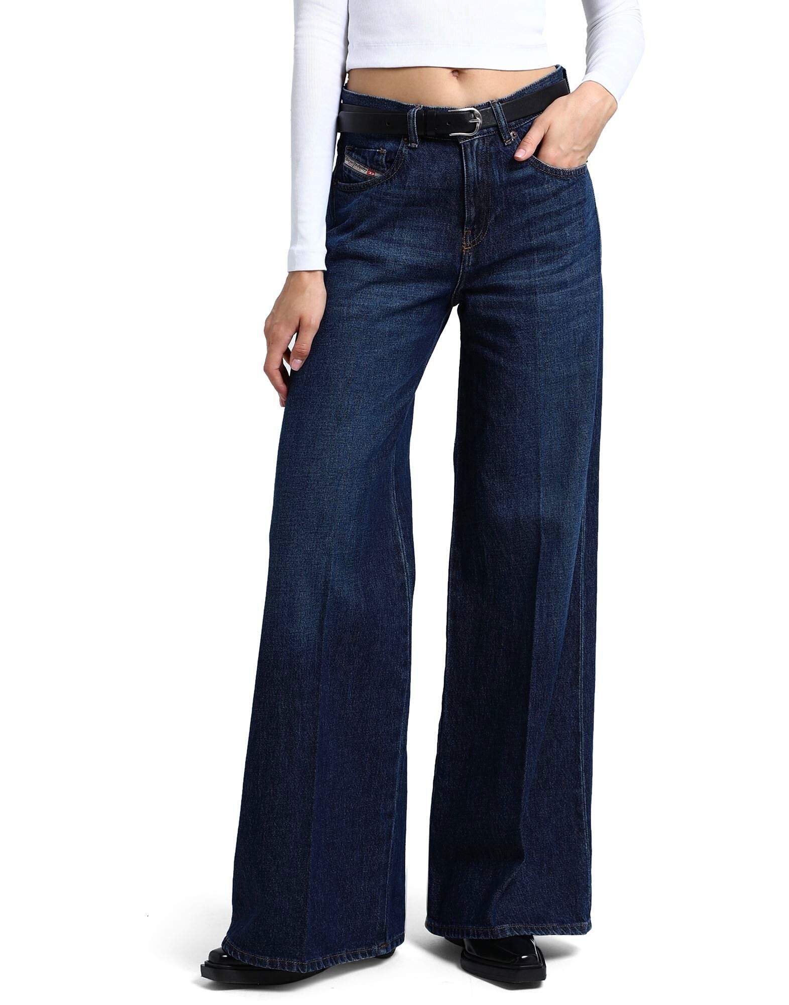 Джинсовая ткань, выцветшая, логотип бренда, однотонный цвет, тёмная стирка, высокая талия, шлёвки для ремня, застёжка на молнии, 1 пуговица, пять карманов, модель: 1978, расклешённый крой и широкие штанины