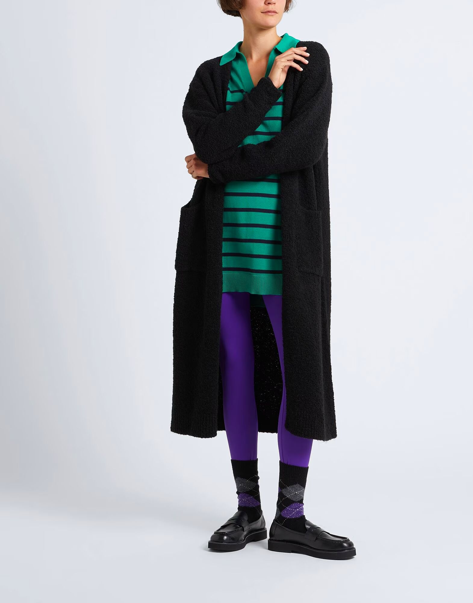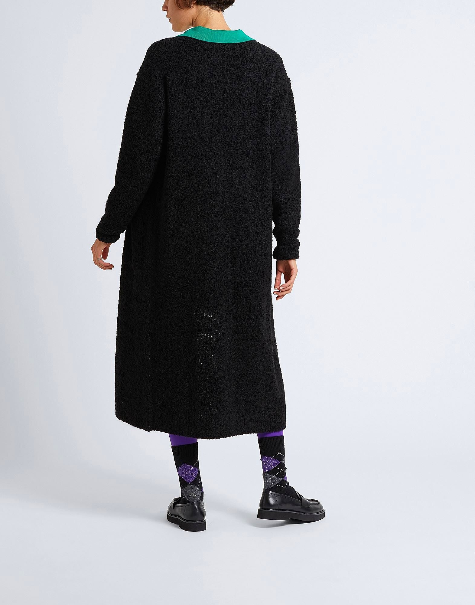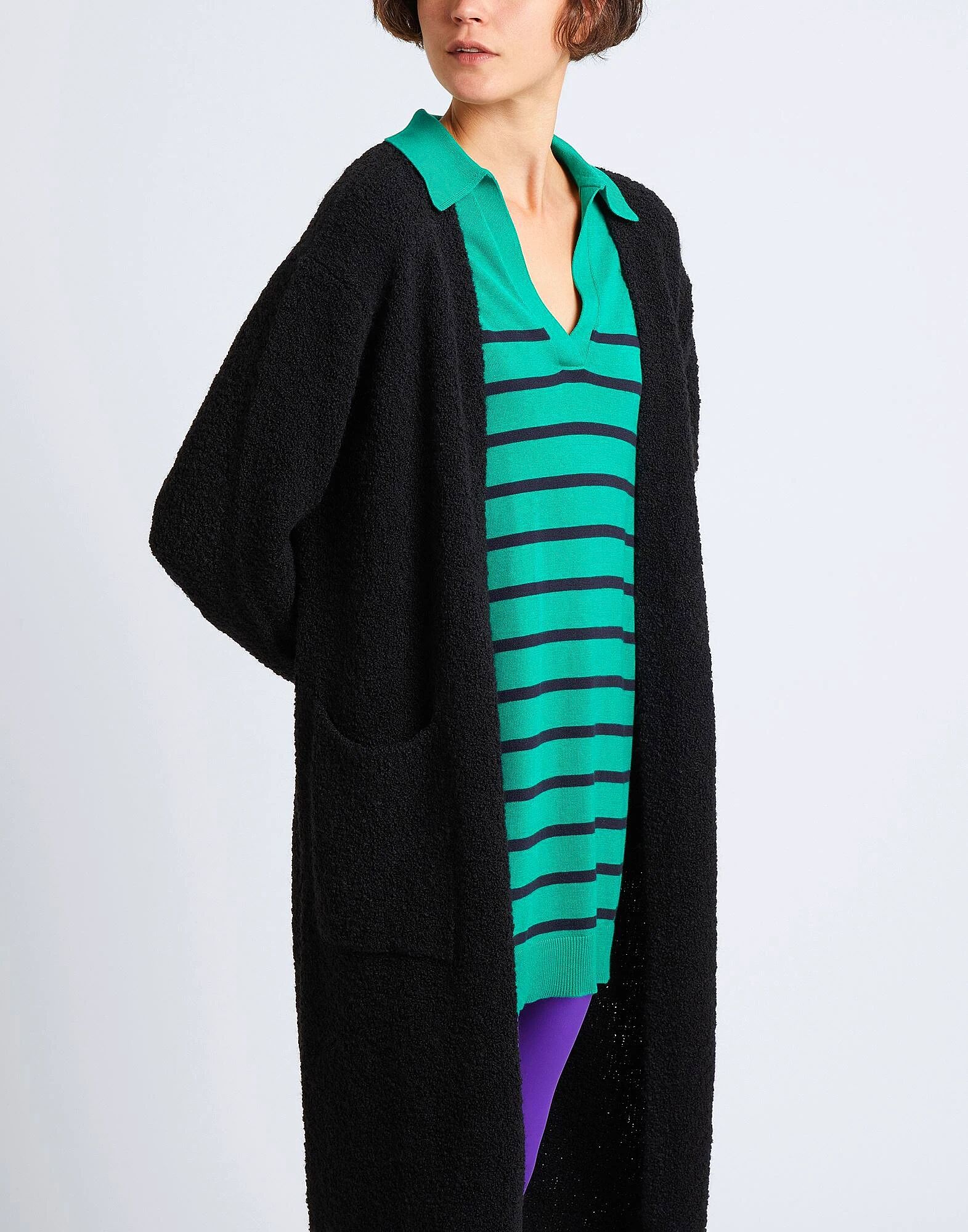 Этот лёгкий трикотажный кардиган из ткани букле с длинными рукавами представлен в однотонном исполнении с глубоким вырезом. Сделано в Италии, имеет свободный крой и два боковых кармана. На модели представлен итальянский размер S/40.