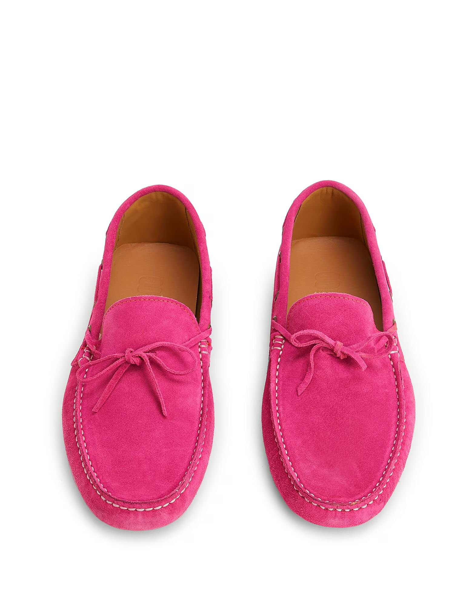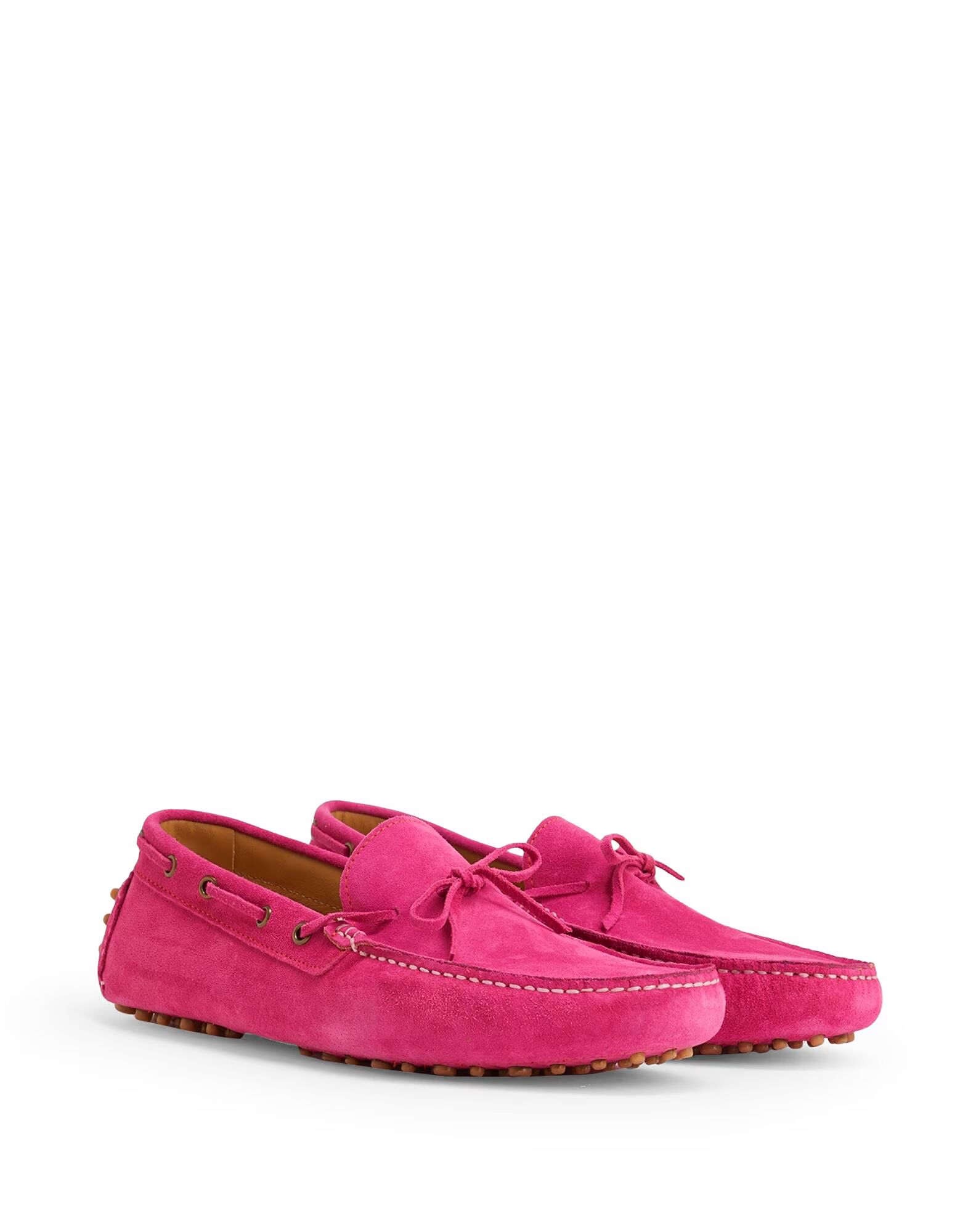 Эти туфли для вождения изготовлены из гладкой замши и дополнены характерными шнурками в тон. Сделаны в Италии. Они отличаются круглым носком и резиновой подошвой с люверсами.